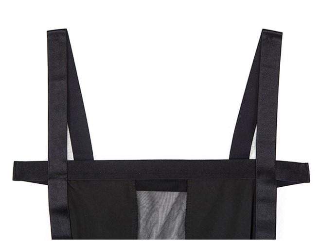 The Aura Gothic Bodysuit is bound to cast a spell that will heat up the blood of even the coldest vampire. The entire bodysuit is divided by one inch straps that detail the torso in a unique style. The sides and upper back are hollowed out leaving the remainder paneled in with transparent mesh and the only exception of a solid panel covering each breast.