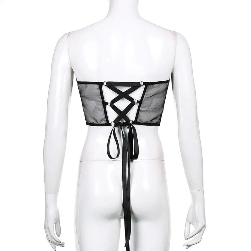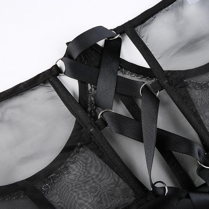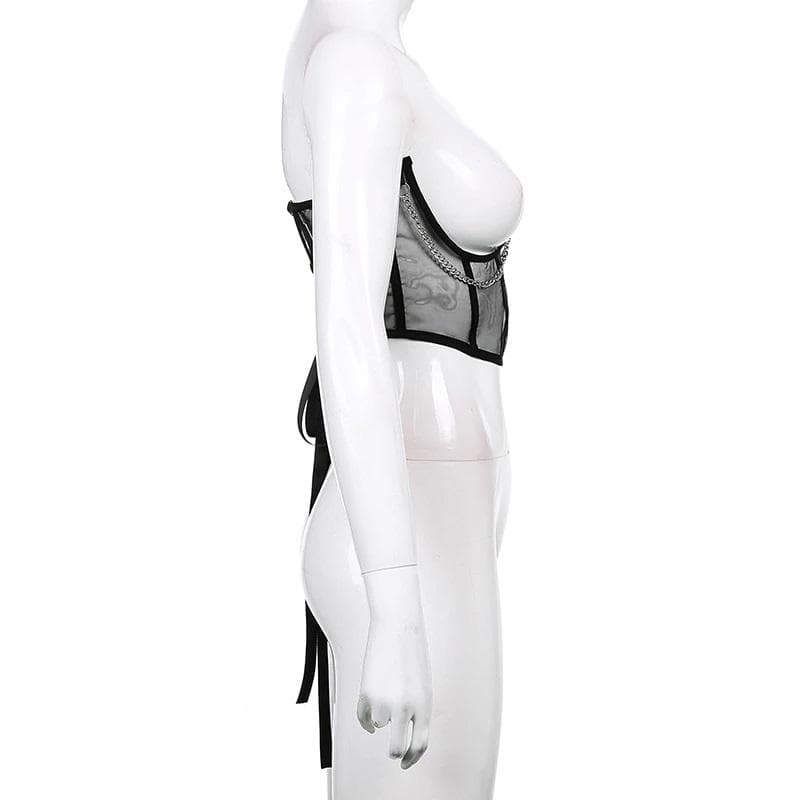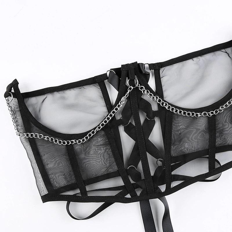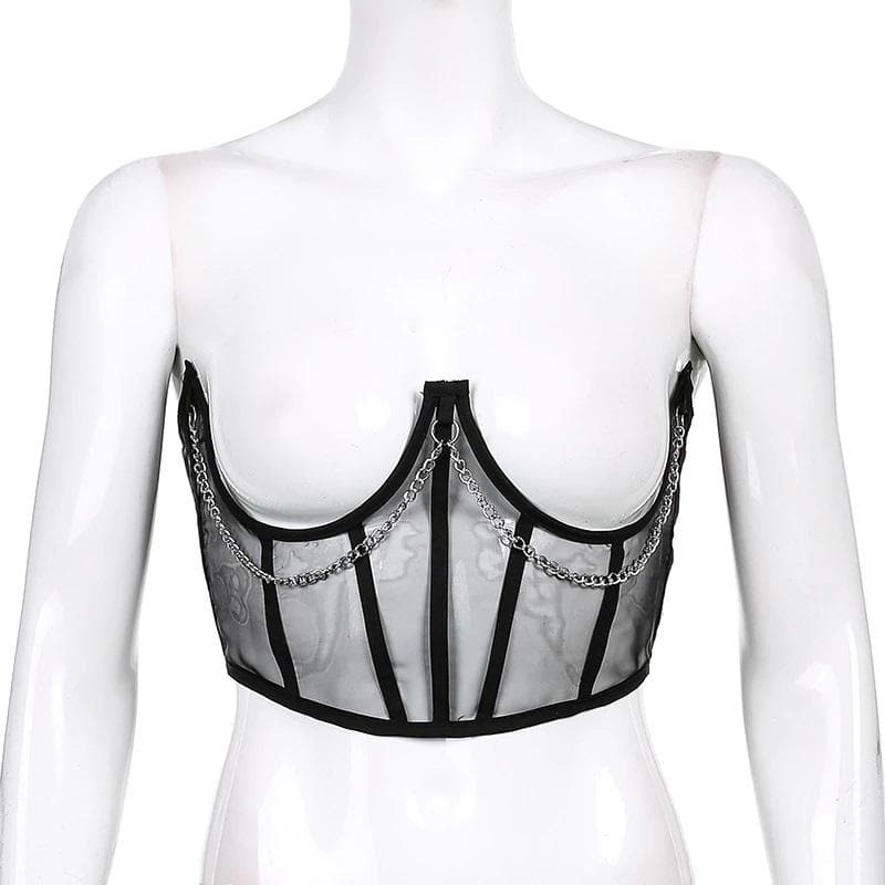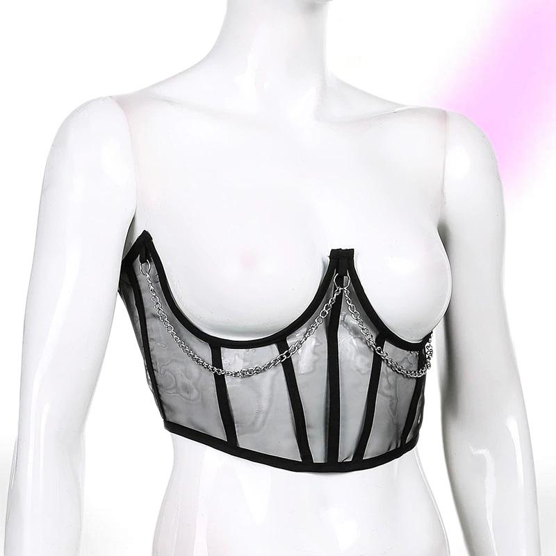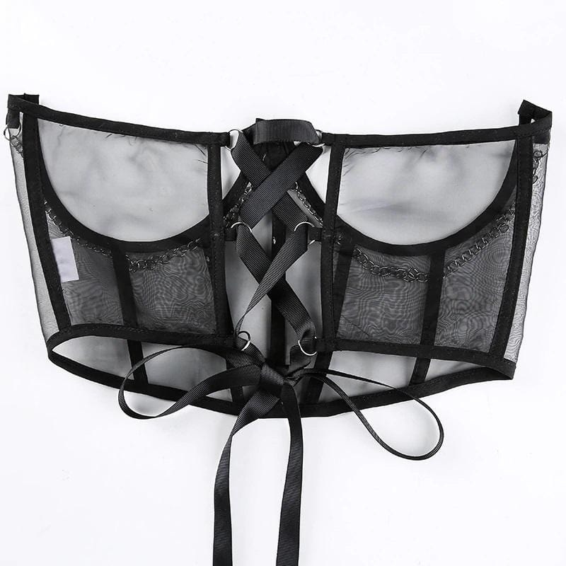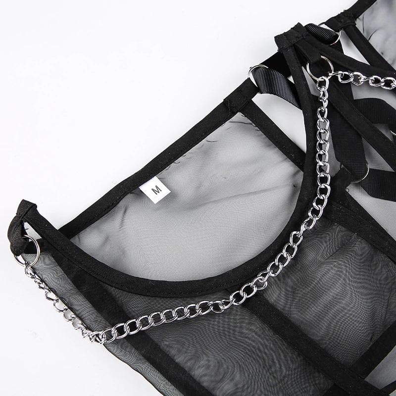 Black Hollow Fashion Corset got ya showin’ them a thing or two. Trap their hearts in this mesh patchwork bustier corset featuring link chains, see-through construction underbust design, and lace uptie closure type at the back.
