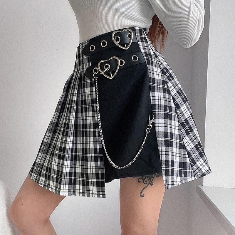 Spook up your grunge girl aesthetic with this pretty plaid mini skirt! Leave 'em spellbound in the asymmetrical cut, pleated fit, and high-waisted design. Be the badest girl at ghoul school in the heart-shaped buckles and metal eyelets, charmed with a metal chain accent. Black and white plaid... their hearts are yours for the taking.