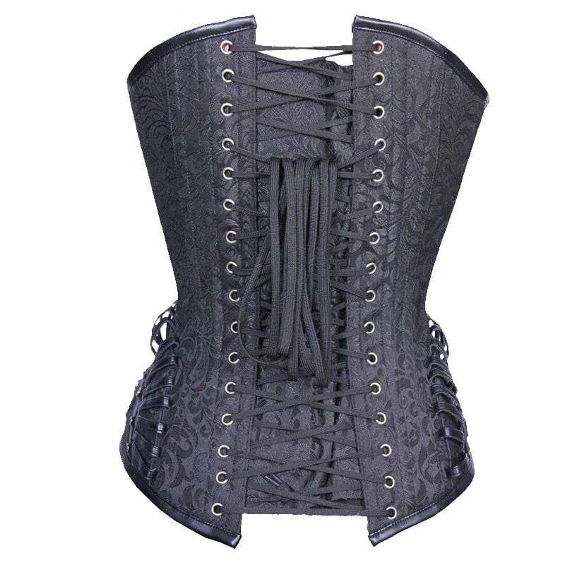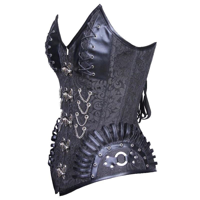 Dark Steampunk Victorian Corset will take you to a new dimension. Top off your ultra sexy look with this overbust classy corset featuring a stylish decoration of criss cross lacing bust cup, multiple chains, front buckle and back lace up closure type good for party, club and more.