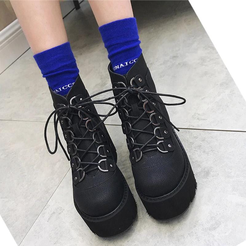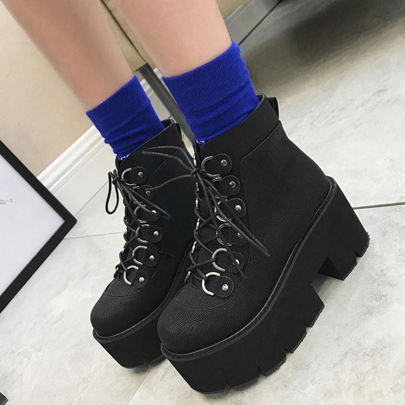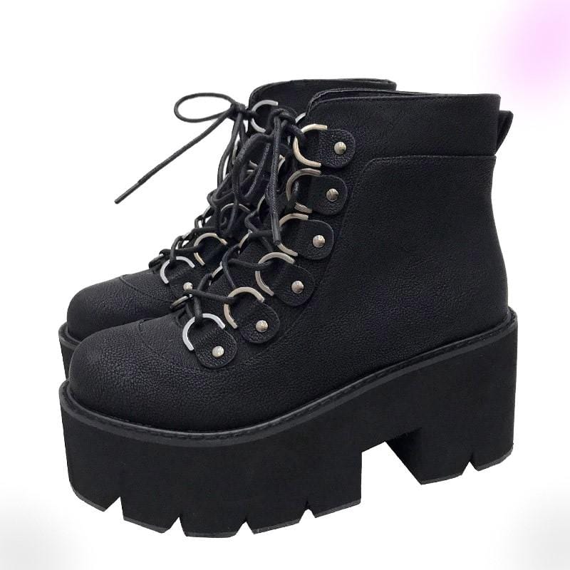 Elegant Black Gothic Boots cuz fashion changes, but style endures. Simplicity is the key to elegance in this lace-up ankle boots featuring a high heels platform, square heel, and round toes good for parties, office, and casual occasions.