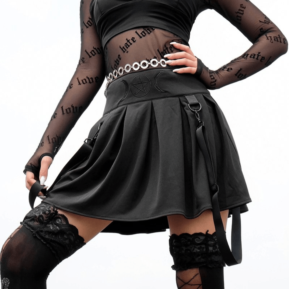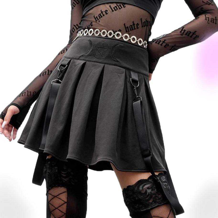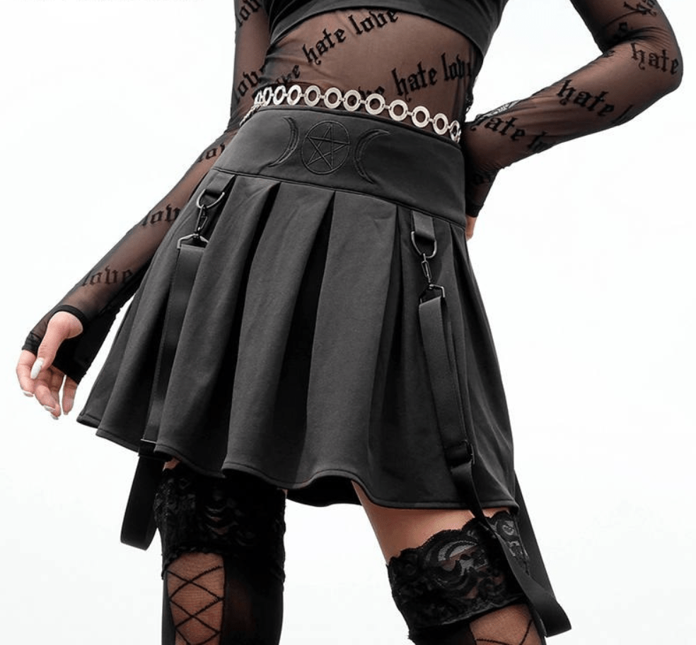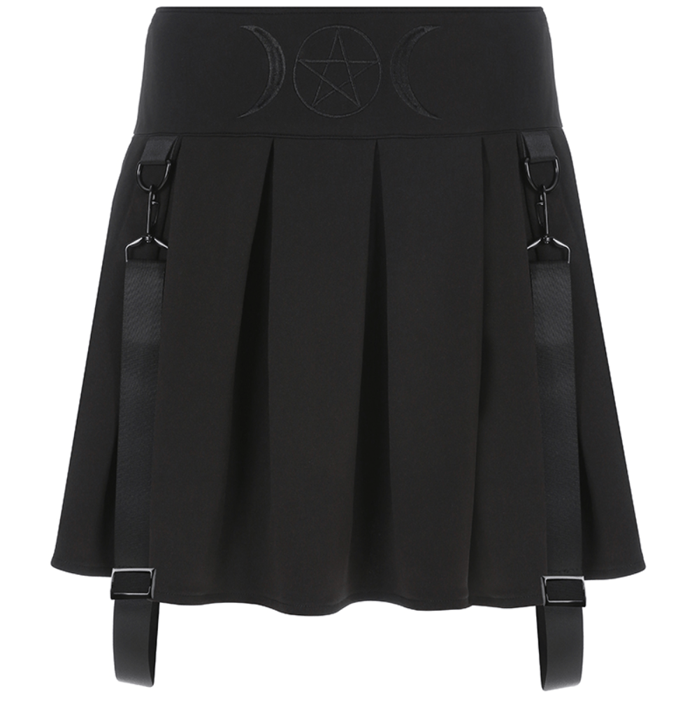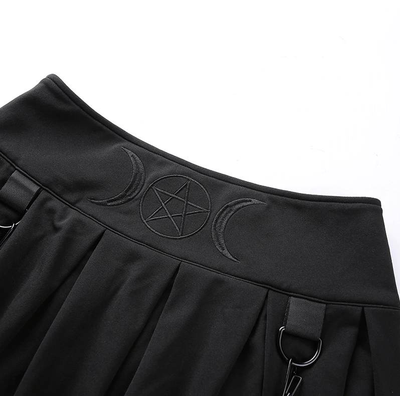 The evanora pleated skirt is a mixed skirt material and is a solid pattern. You have the beautiful three moon phase etched on the skirt too.