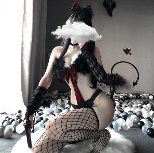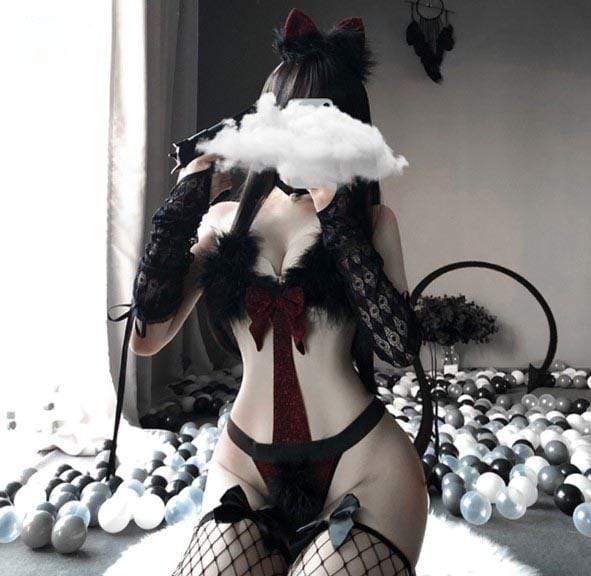 We should not try selling it after that beautiful bow, but have you seen that absolute beautiful bra?? The red cloth linking to the panty is a plus. Not to forget the kitty headband that will just not make any hints missed!