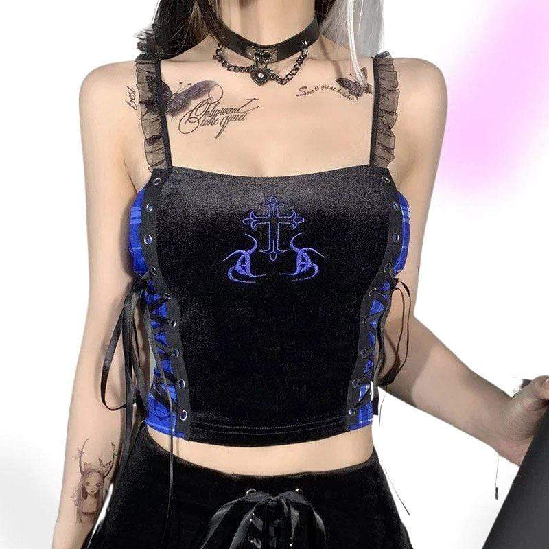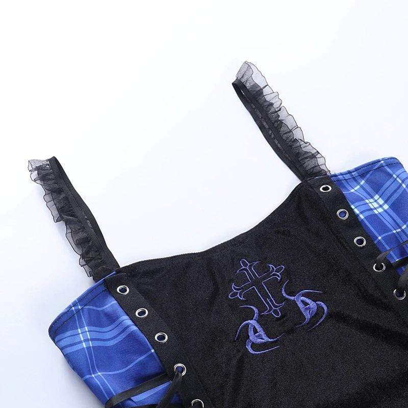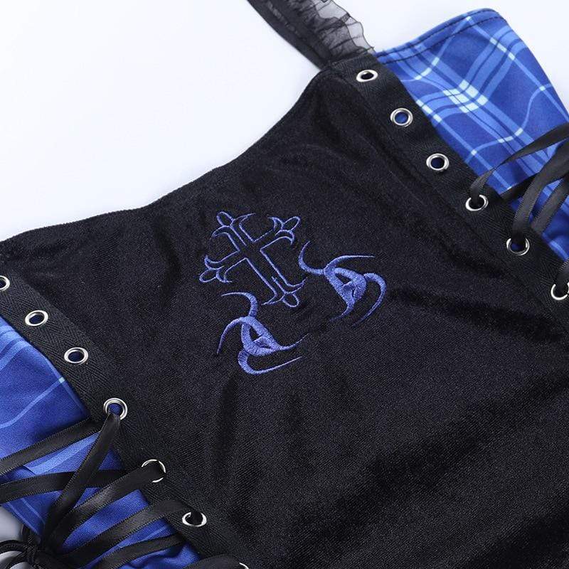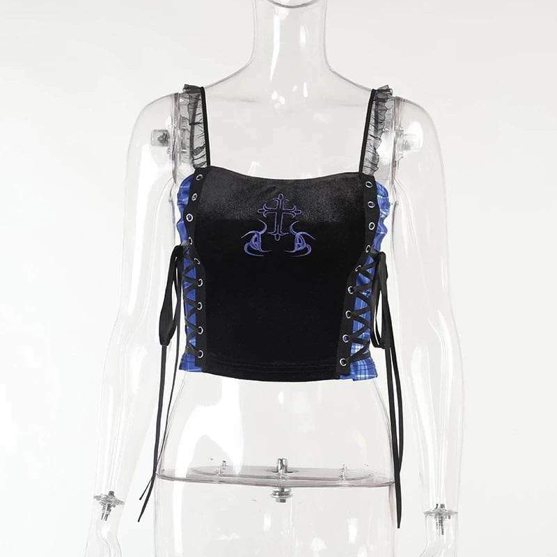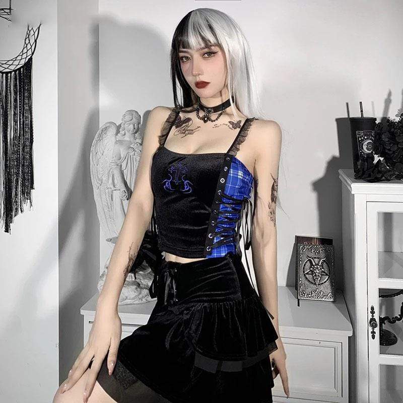Get lost in this?cute and creepy velvet top, featuring?a fitted slightly crop bodice complete with black ribbon lacing. Summon gothic romance to your alt style in the blue plaid sides, silver rivets, and statement gothic crucifix at the front.?Finished with black ruffled straps for the perfect fit.?
