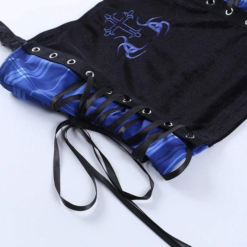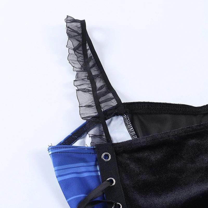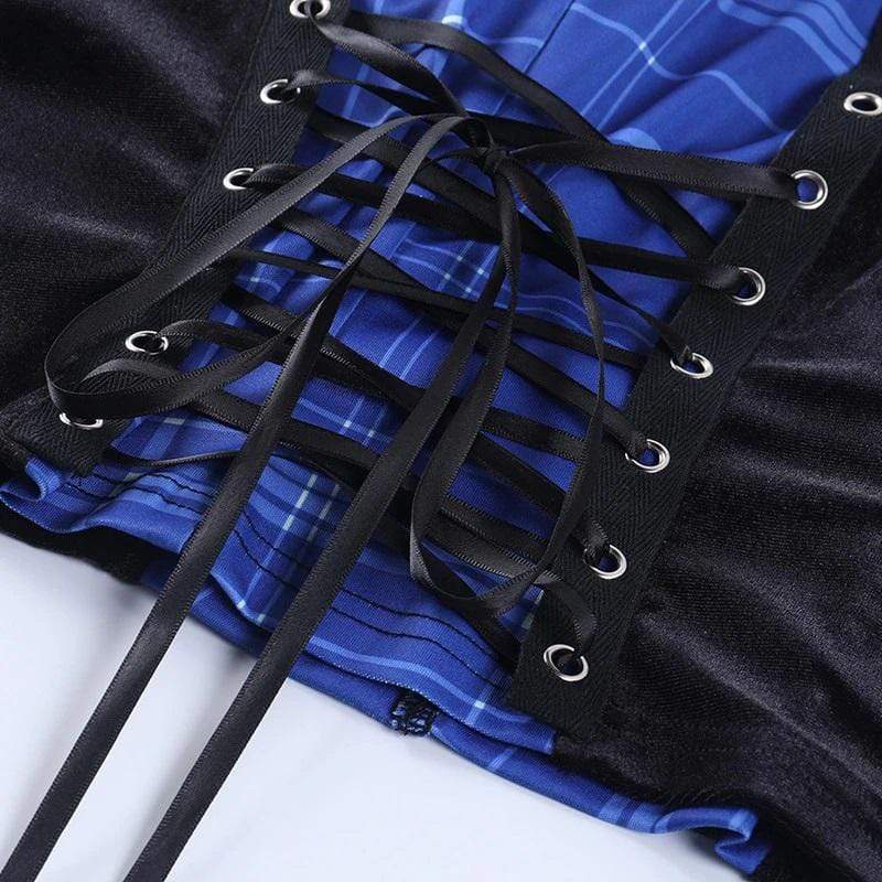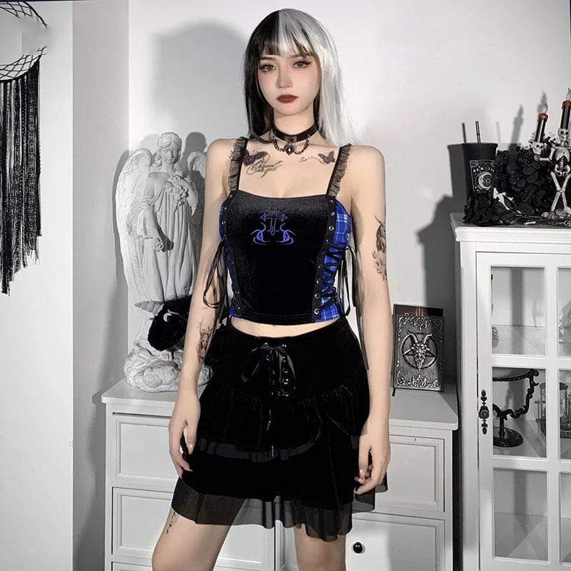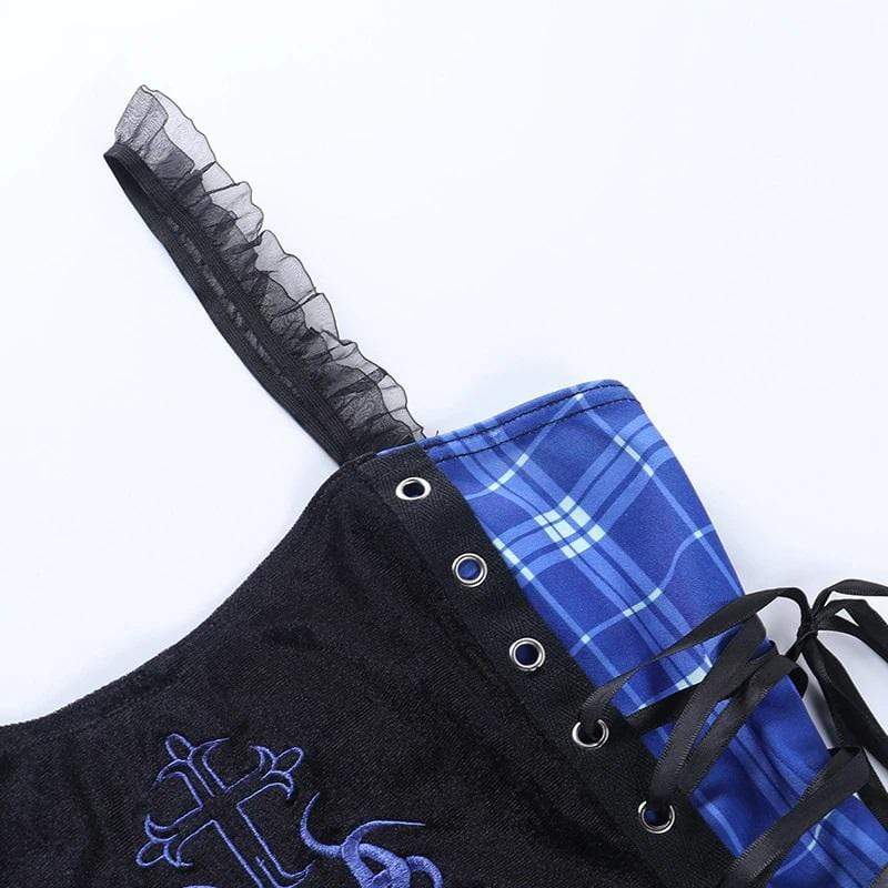 Get lost in this?cute and creepy velvet top, featuring?a fitted slightly crop bodice complete with black ribbon lacing. Summon gothic romance to your alt style in the blue plaid sides, silver rivets, and statement gothic crucifix at the front.?Finished with black ruffled straps for the perfect fit.?