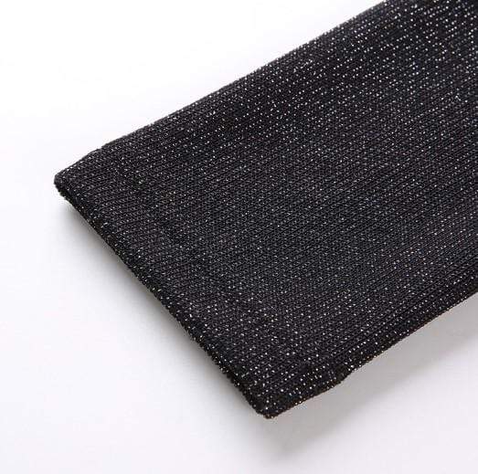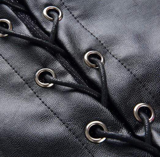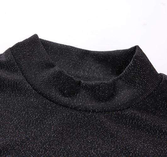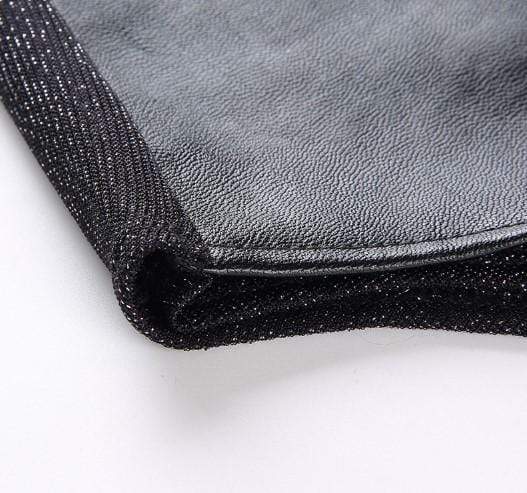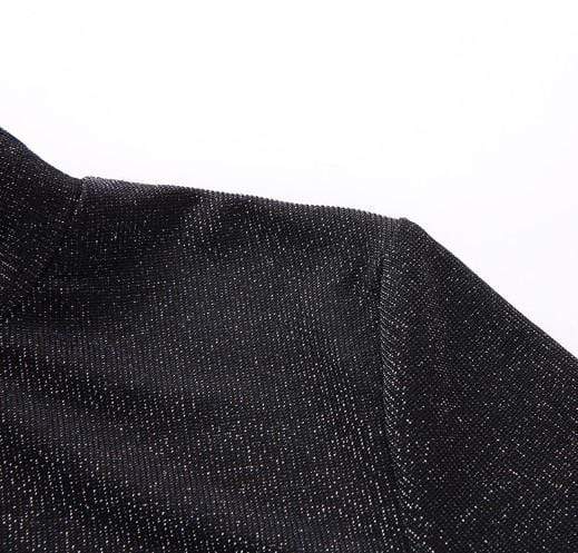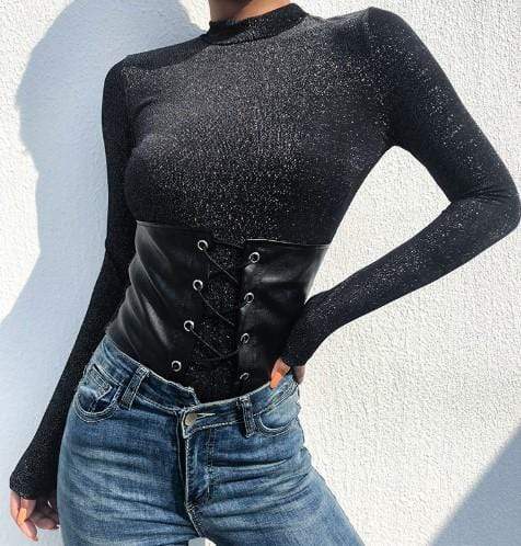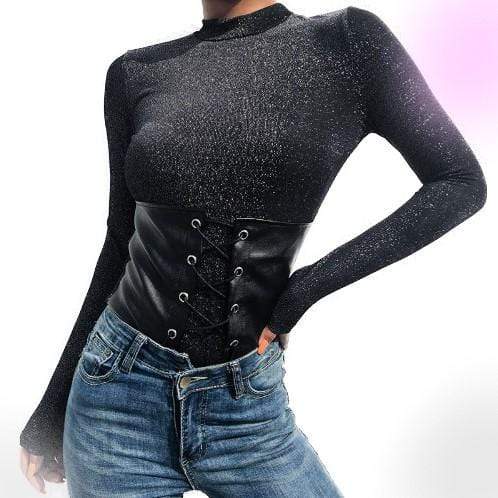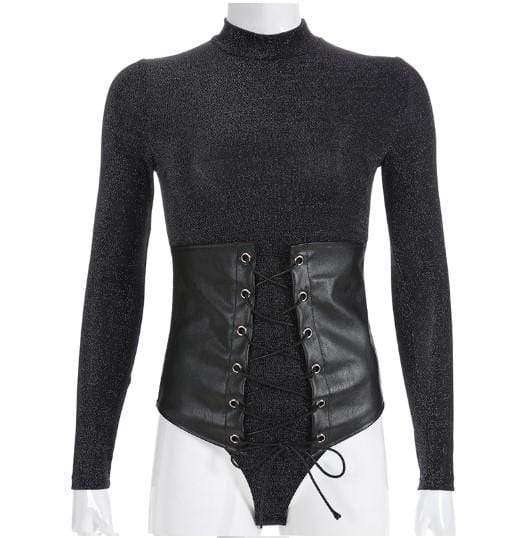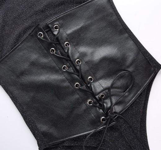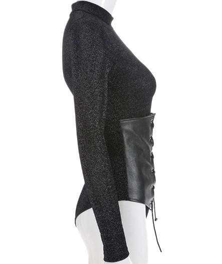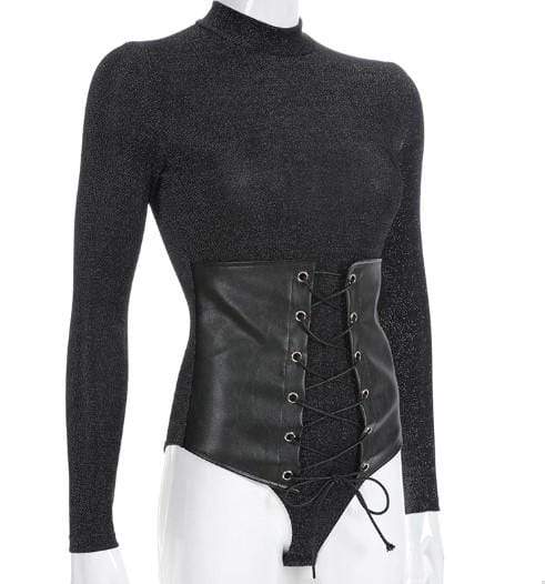 The Gothic Glitter Bodysuit is made of a polyester spandex and the material is tightly woven with strands of silver thread that give this piece a shimmering glitter effect. The bodysuit has a short round collar, fully covered torso, long sleeved, and has a faux leather sash sewn down the sides from the waist to the hips that laces together through twelve silver O-rings.