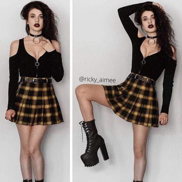 Versatile and available in three colors, the Harajuku skirt is a beautiful blend checkered pattern and the cotton material. This is the kind of skirt that can naturally go over any Gothic top. The skirt is pleated and has a place for your belt.