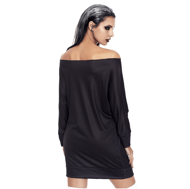 Gothic Skull Pumpkin Dress you're heading to the party night, Halloween Gothic style babe! Giddy up in this cute AF black dress with skull and pumpkin print that has an off-the-shoulder neck N’ gathered sleeves.