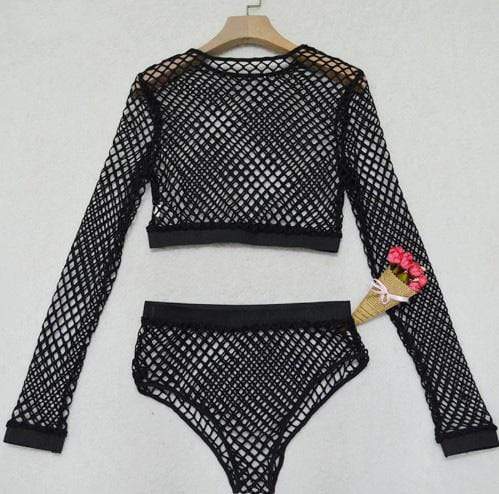 Slip into this two piece sexy Black Mesh Bodysuit and you will be sure to get the attention you are looking for. The large open mesh is designed to give only a hint of covering, yet doing so in style. The crop top is long sleeved and complemented with a matching set of briefs.