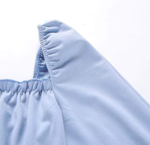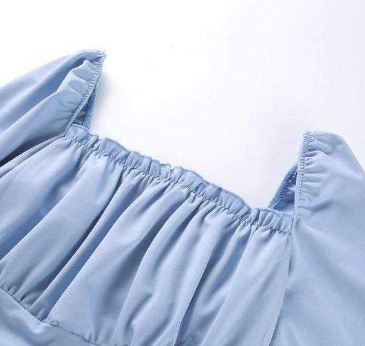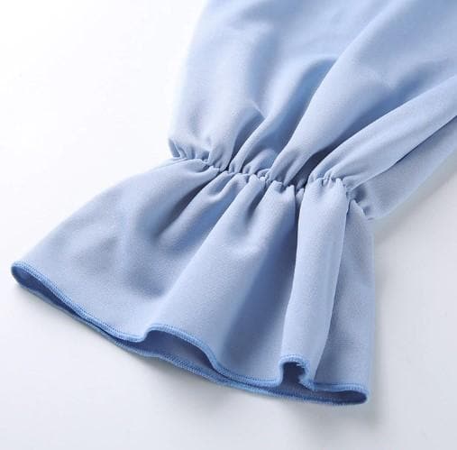 This could also be considered of a Victorian Steampunk style with its long sleeves that are gathered above the wrist while leaving an open cuffed feature, and the straight cut bust line with gathered straight seam underneath.
