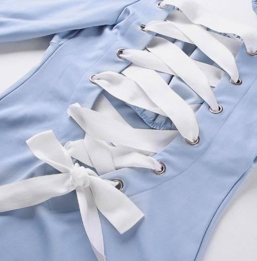 The back of this bodysuit is decorated with 6 silver O-rings on each side of a deep V cut that is laced up and tied in a bow.