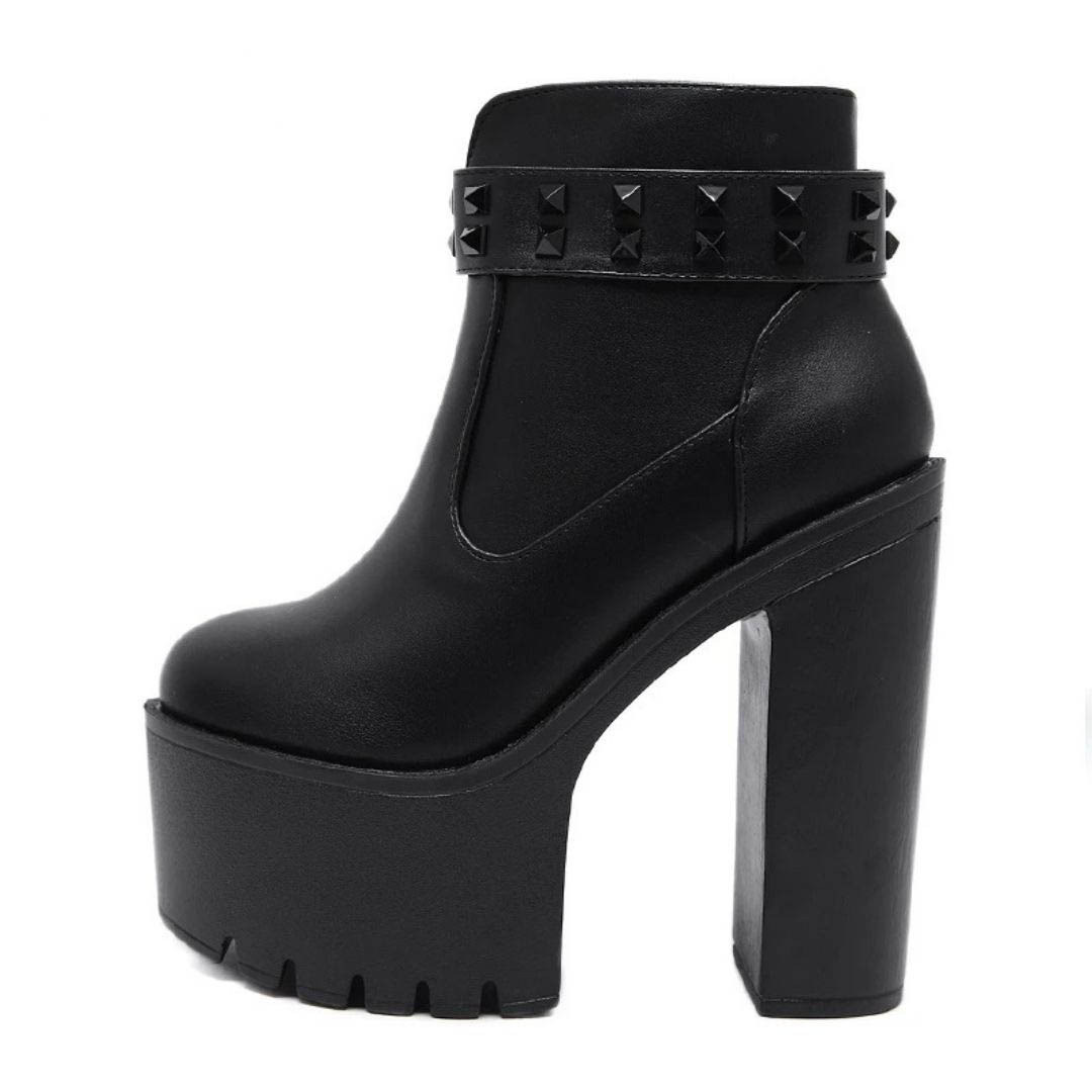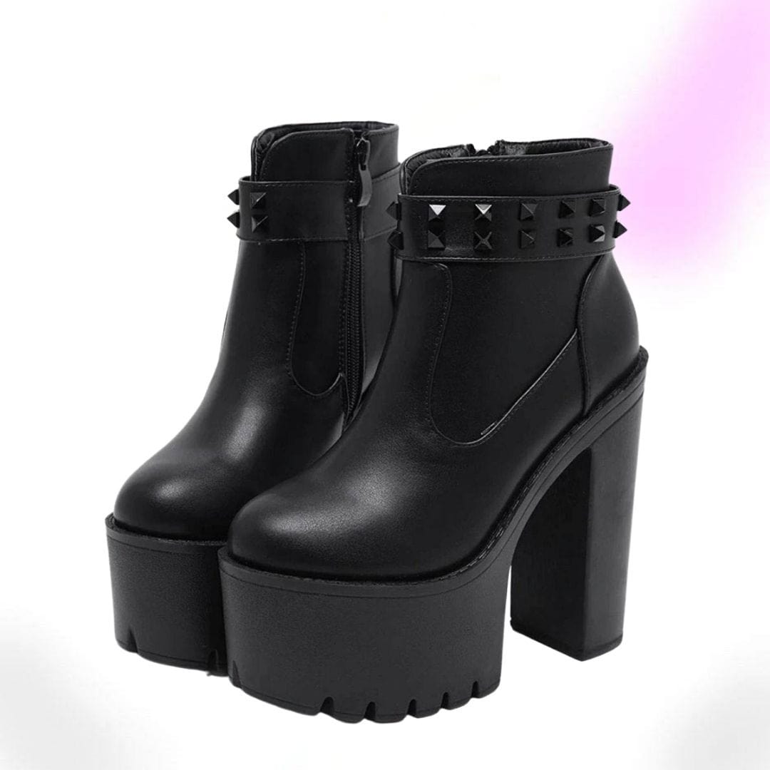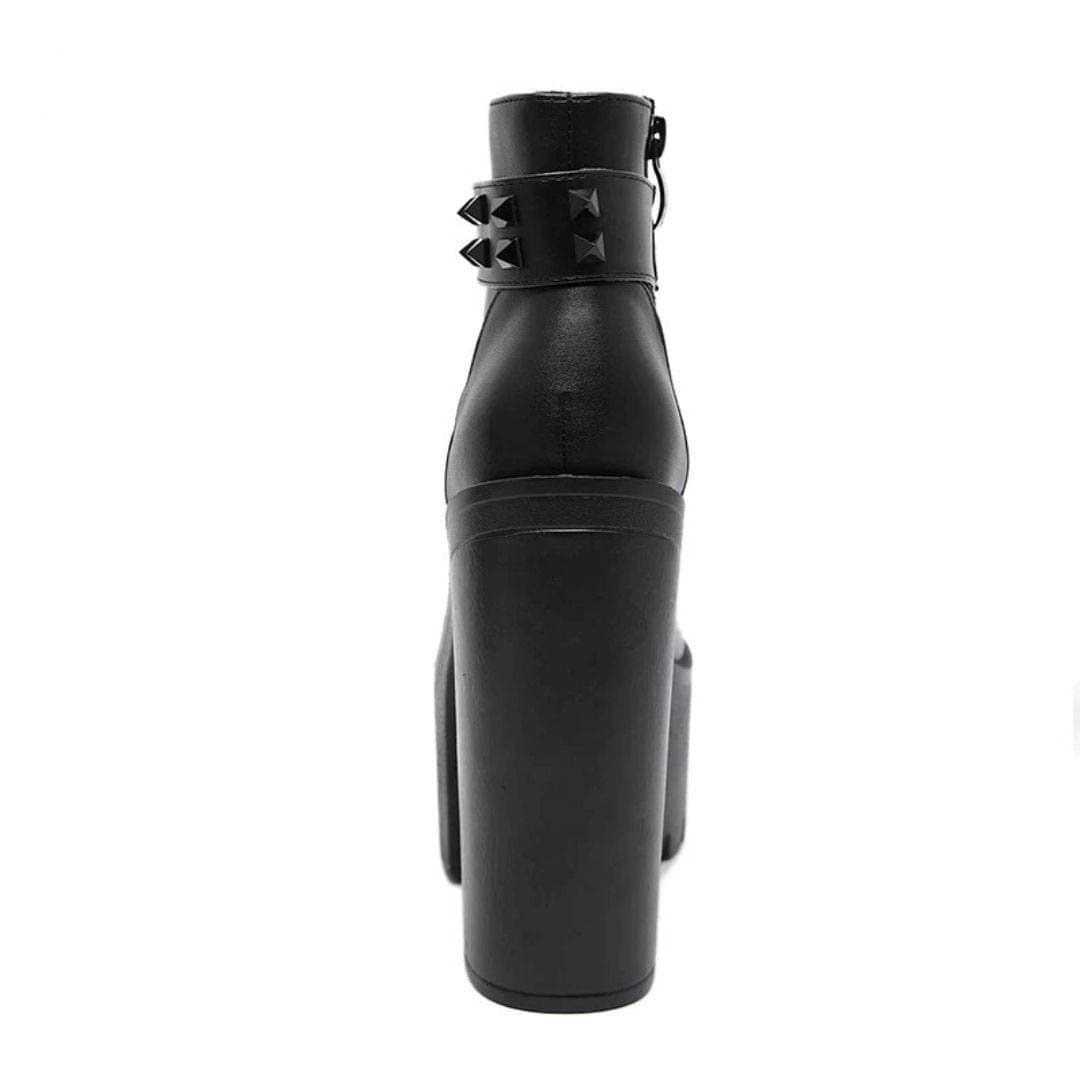 Get ready to turn some heads with the 'Hades Gal' statement platform ankle boots! Featuring a soft PU-leather body that fits like a pin, accent rivets, zipper closure and elevated with a 6.5cm/15cm platform heel. Perfect for asserting some energy to yer nightlife, shoots or outings from the crypt!
