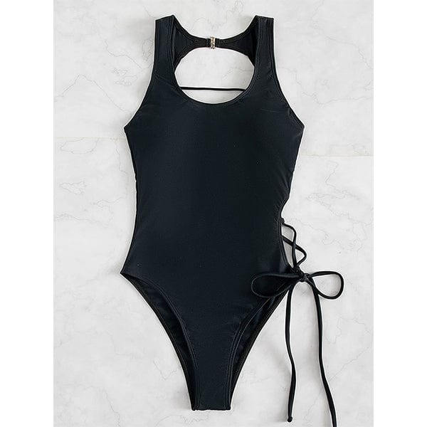 Feel the beat under the sun with the Hot Beat Lace Up Swimsuit. Have fun in this one piece that has a scoop neckline and asymmetrical side lace-up design from the side to back and adjustable ties.