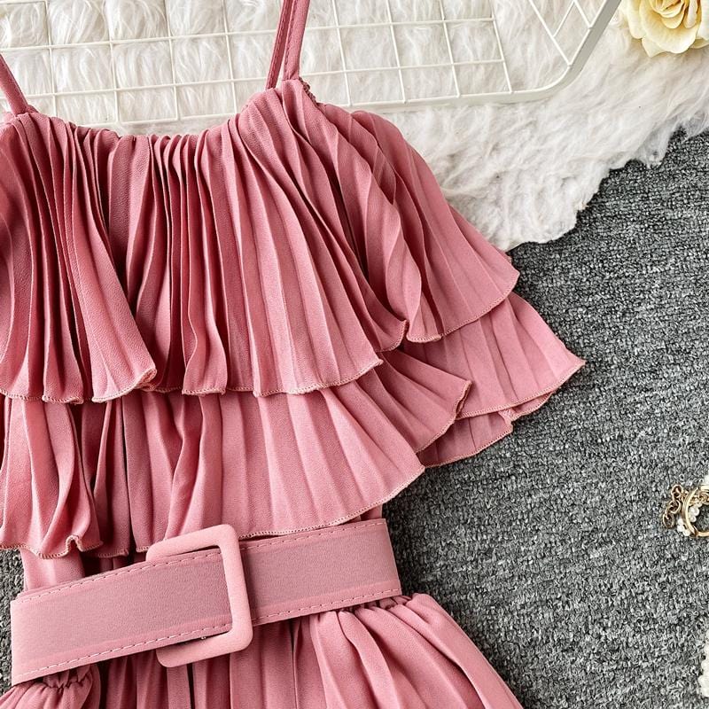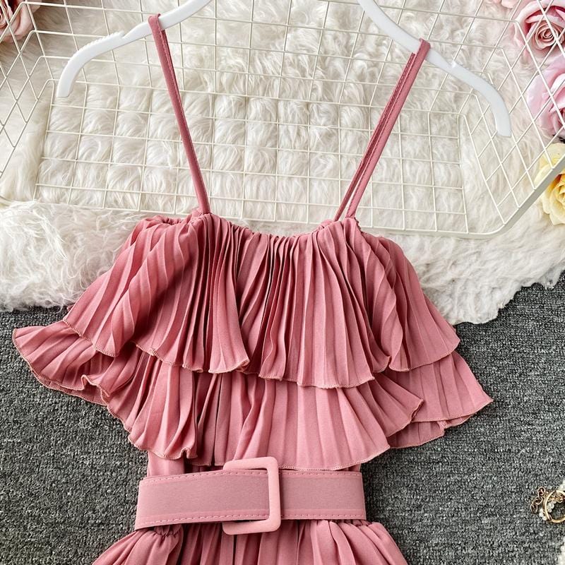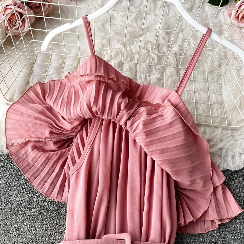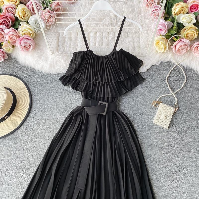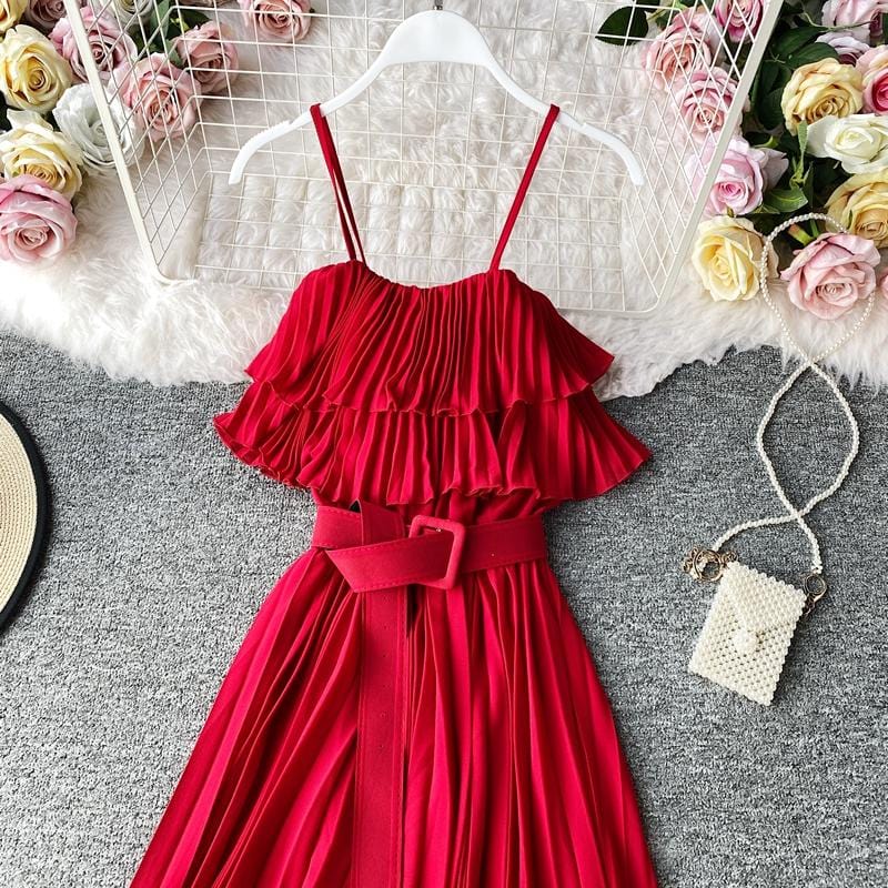 Save the last dance for me, darling. This beautiful Bardot-inspired pleated midi dress features a delicate flounce and thin spaghetti straps. With a statement wide belt, this amazing dress can easily be worn. Dress up or down to match your mood.