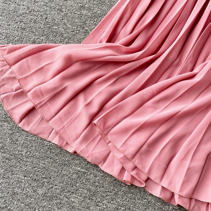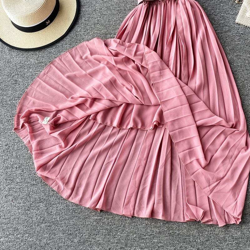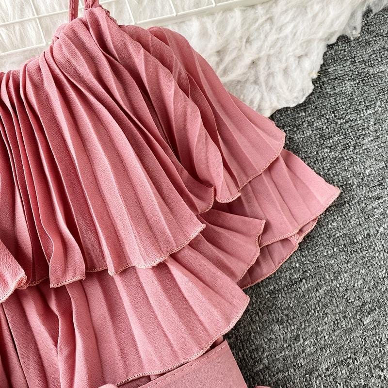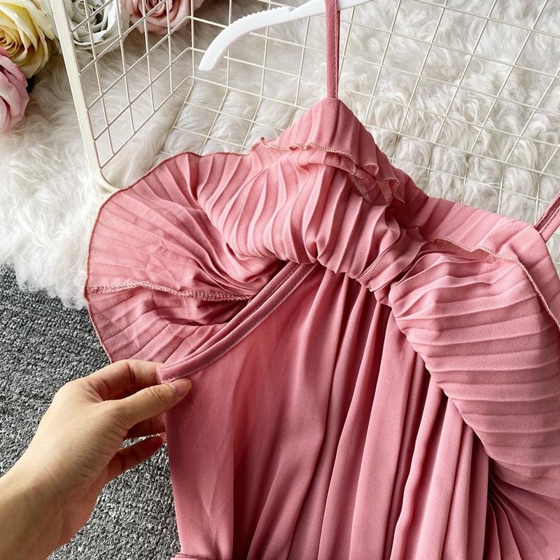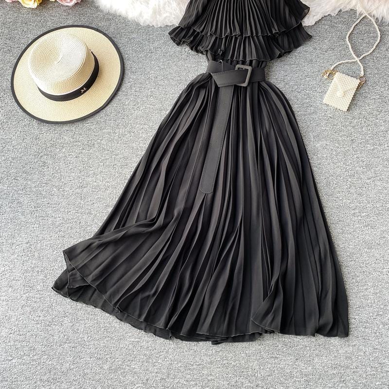Save the last dance for me, darling. This beautiful Bardot-inspired pleated midi dress features a delicate flounce and thin spaghetti straps. With a statement wide belt, this amazing dress can easily be worn. Dress up or down to match your mood.