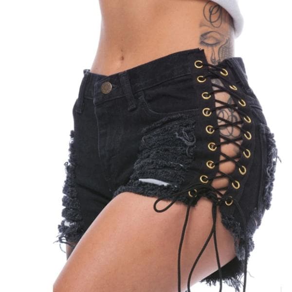 The Lace Up Torn Black Short is serving tea right from the beginning till the end. These are cut out for all of us who want to feel extra badass today. The lace keeping both the sides guessing, and the rivet decoration are just too much and we own it!