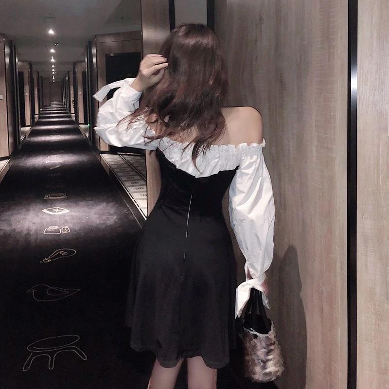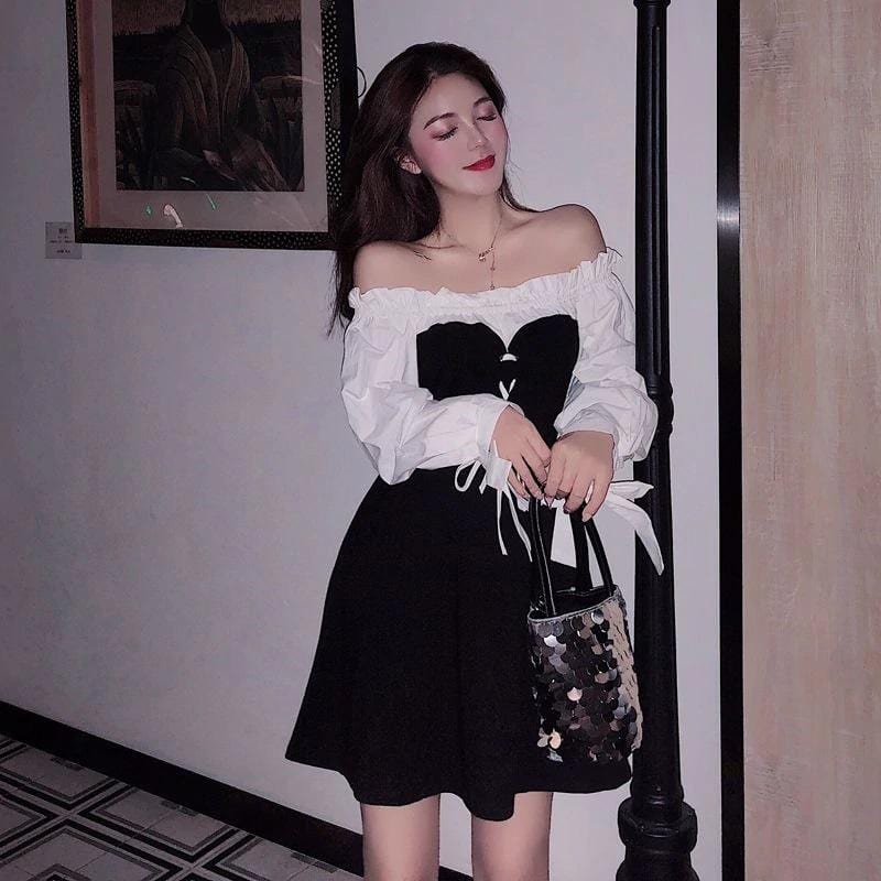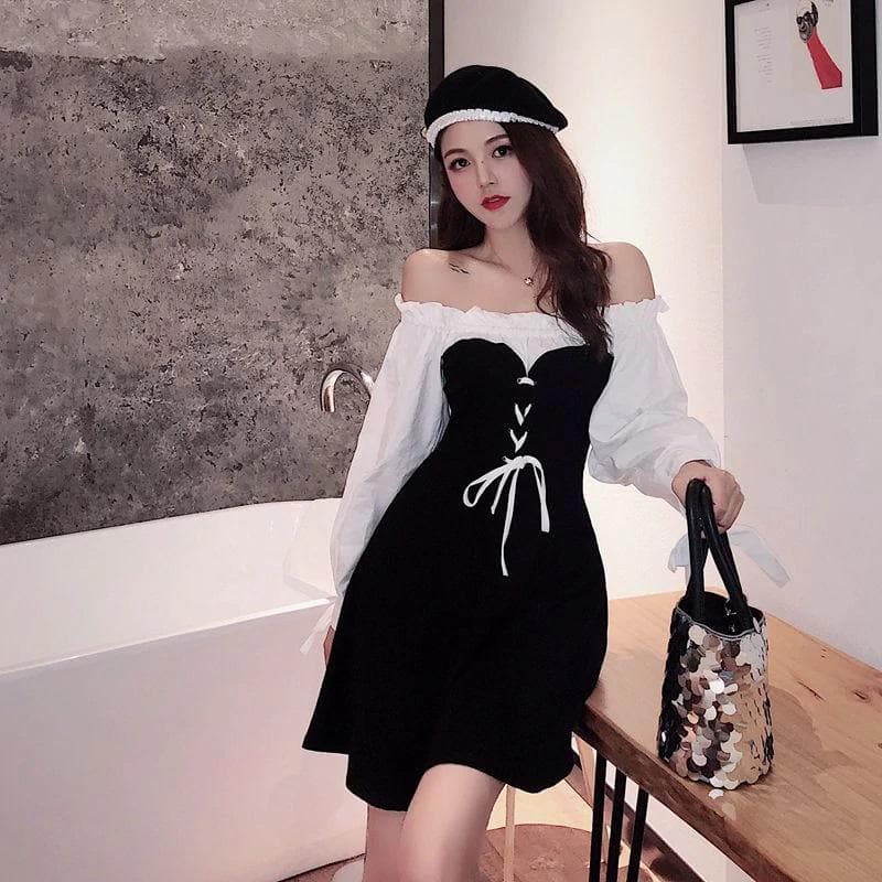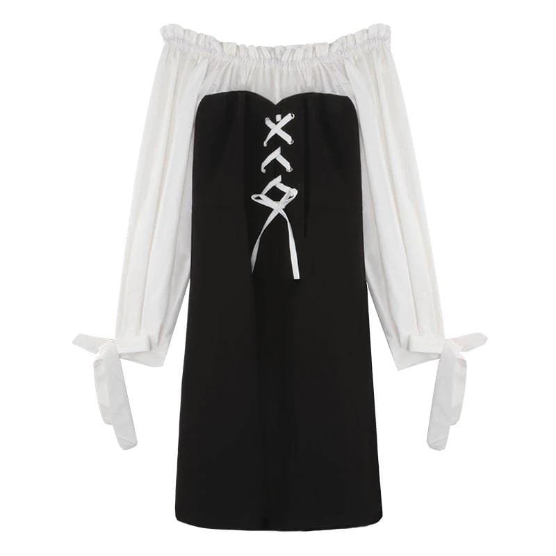 Lolita Off Shoulder Dress got ‘em distracted by ur beauty, babe! Have 'em risking it all over u looking hot and stunning in this long sleeve mini dress with an off-shoulder white bishop sleeve construction and black lace-up tie dress.