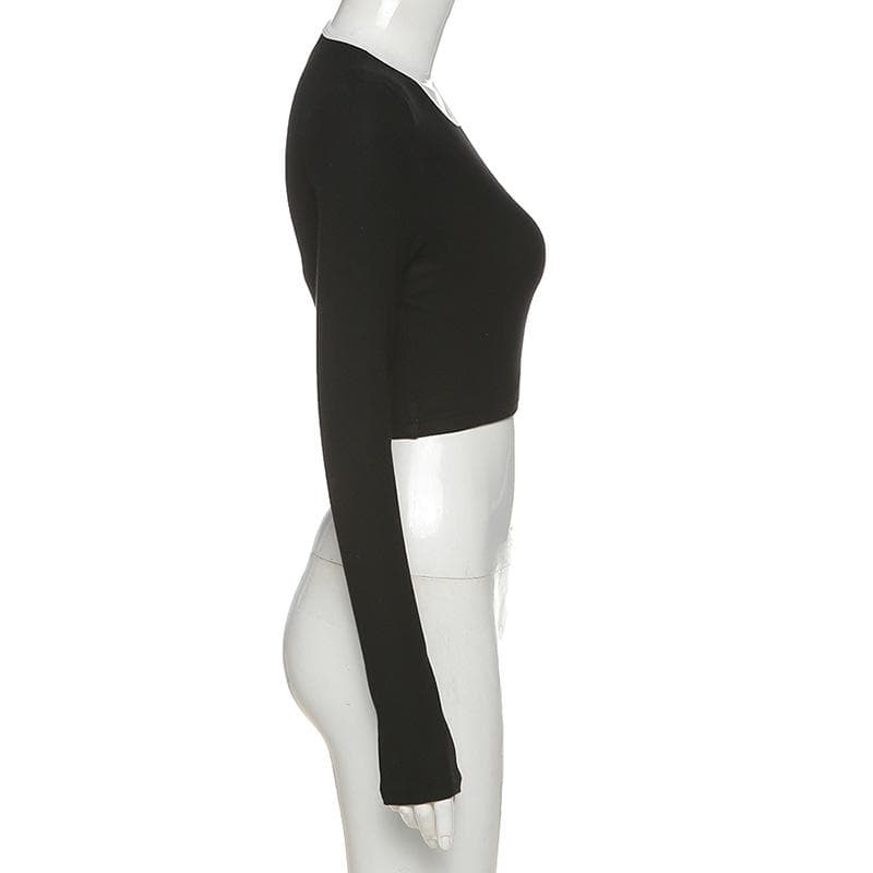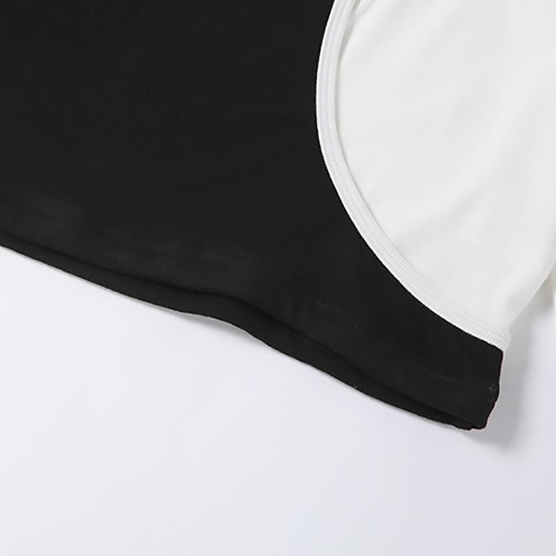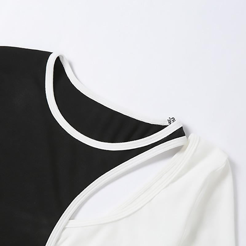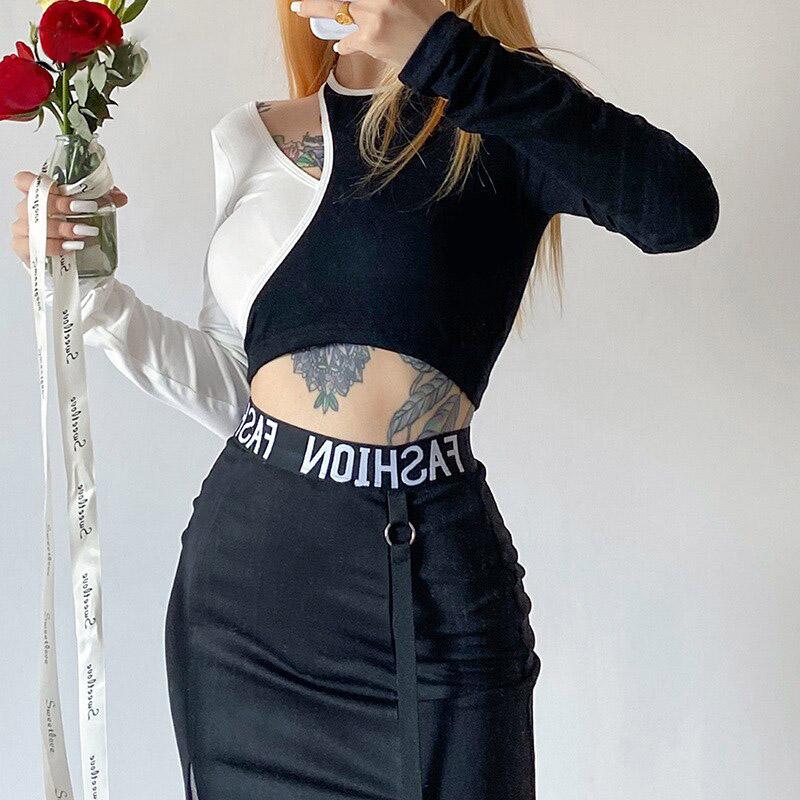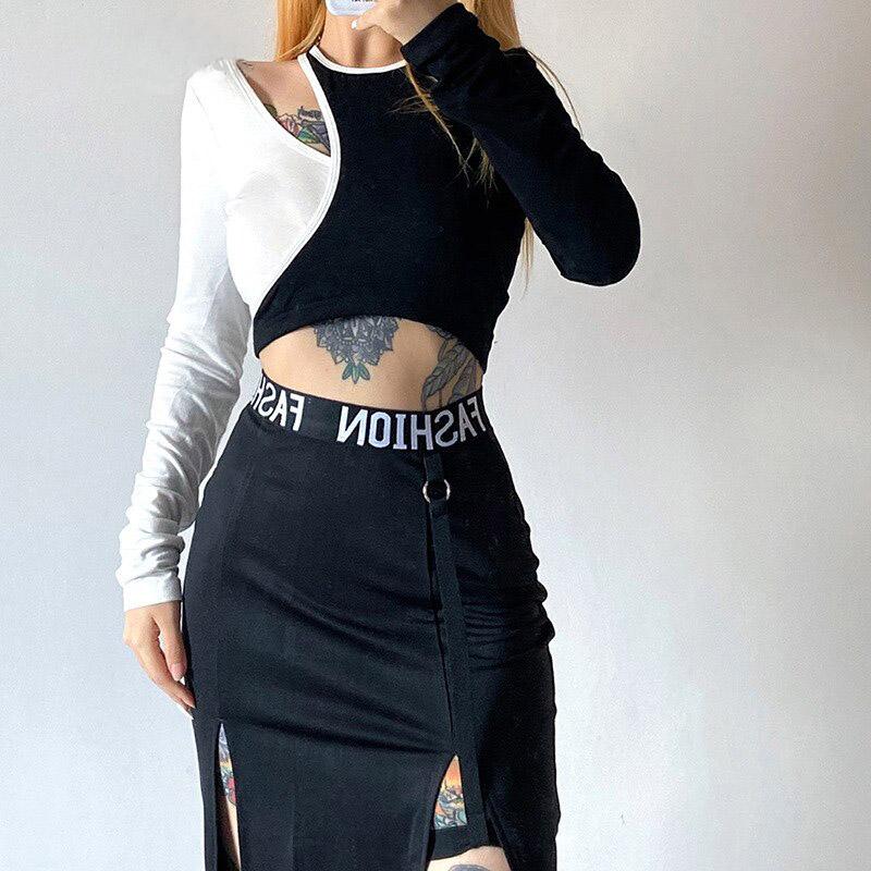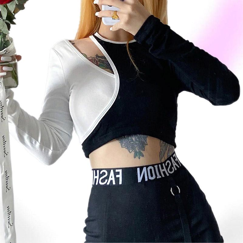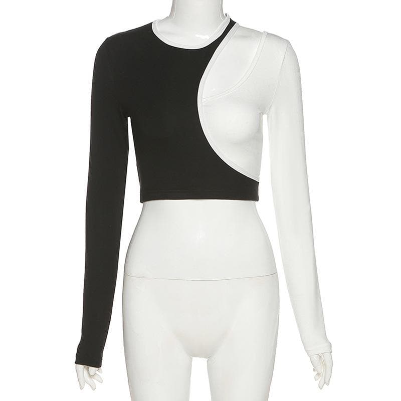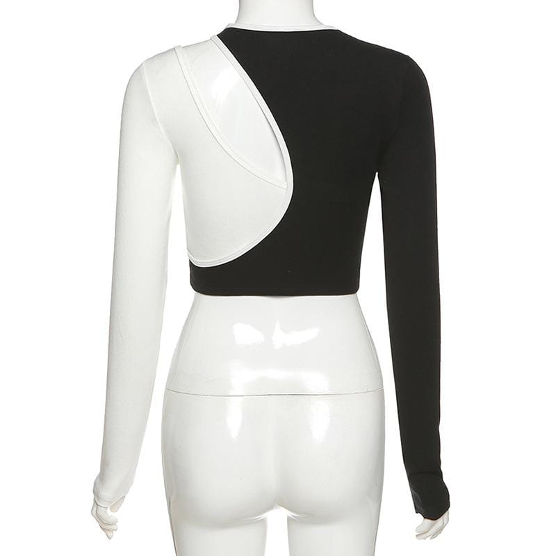 Lucky Patch Gothic Crop Top cuz you make your own luck beyotch! This sexy aesthetic crop top features its asymmetric look with black and white patchwork style. It has a hollow-out long sleeve style with a slim-fitting design.