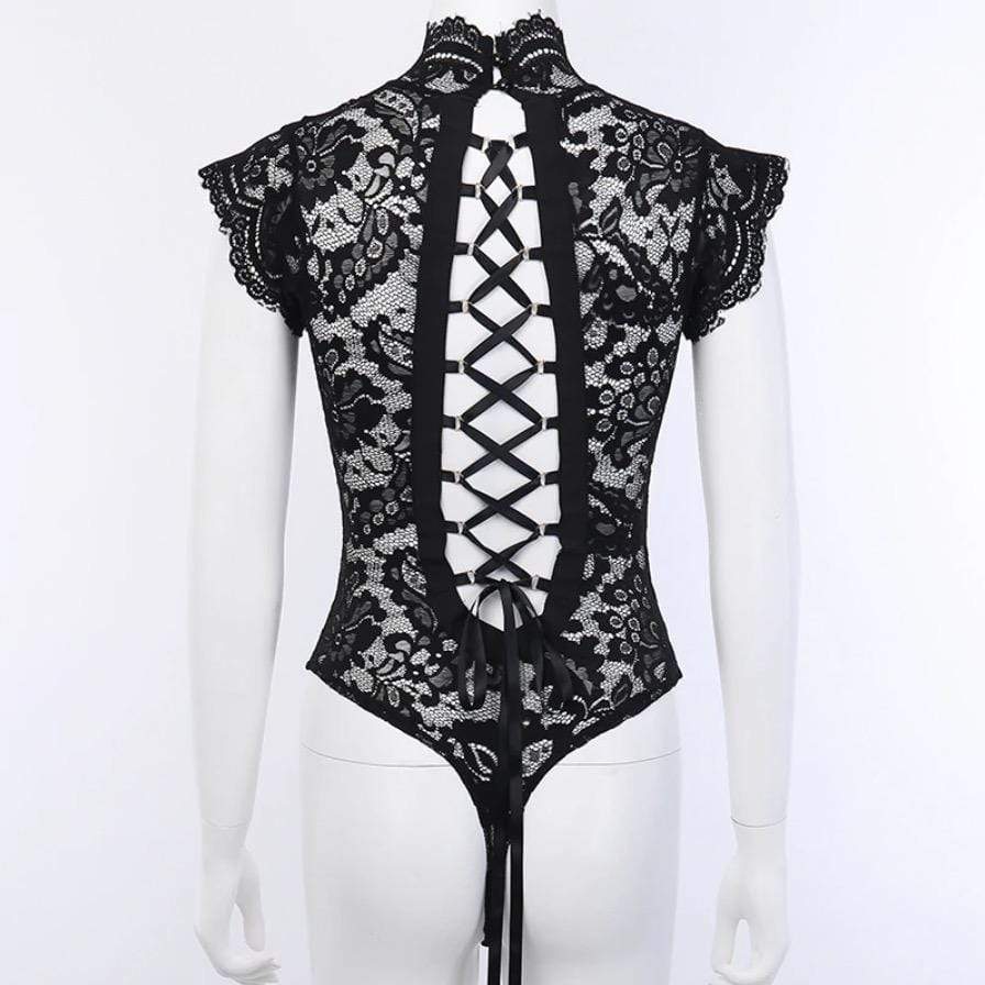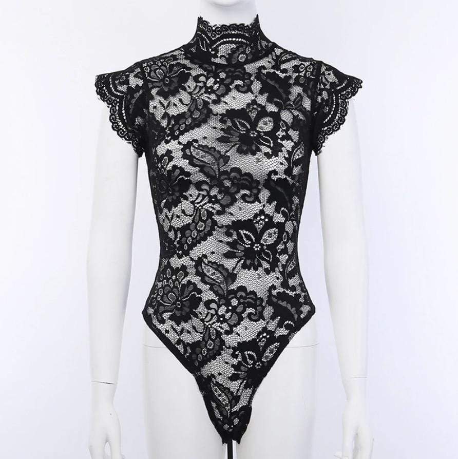In highlighting the finest details of this exotic bodysuit, the beautiful lacing in its teardrop shaped open back... that begins just under the lace choker neck collar and intricately flows all the way down to the waist, is most outstanding. Just as the opaque flower design with the scallop edged shoulder sleeves add elegance to the cut, so do the high thigh lines.