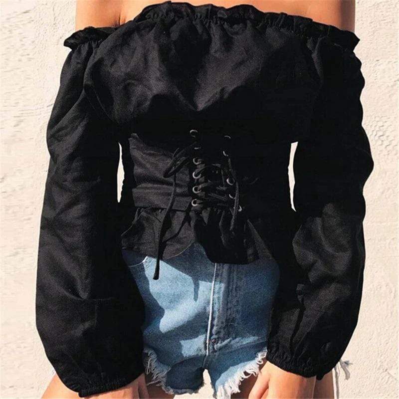 We're all a little devilish inside! A peasant blouse with a gothic edge, this off-shoulder blouse is super stretchy with ruffled hems and corseting at the front.