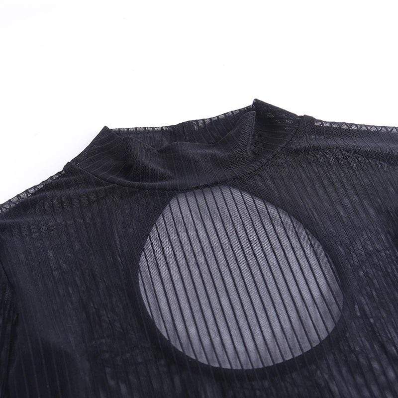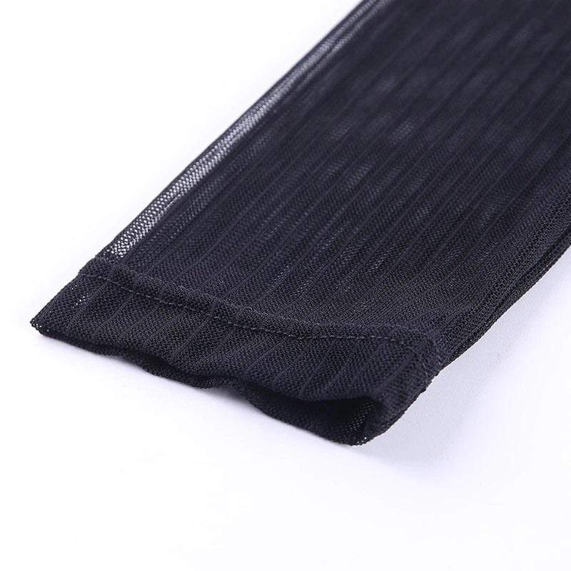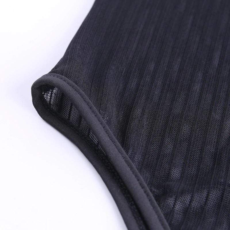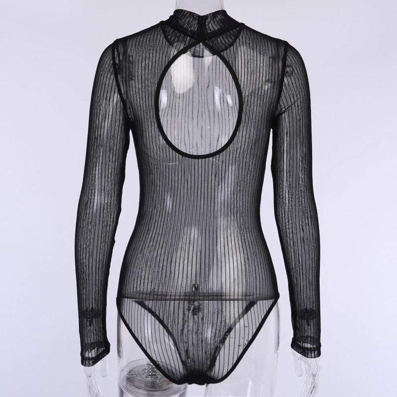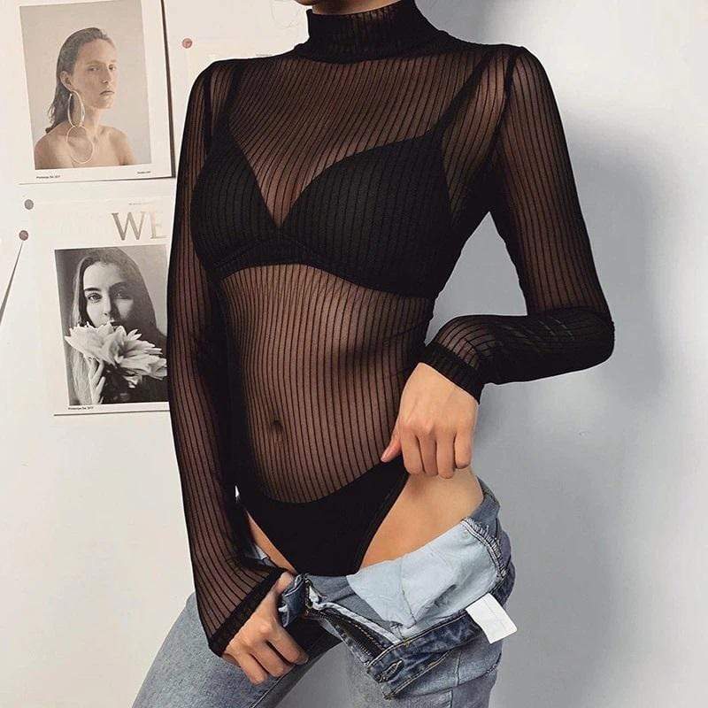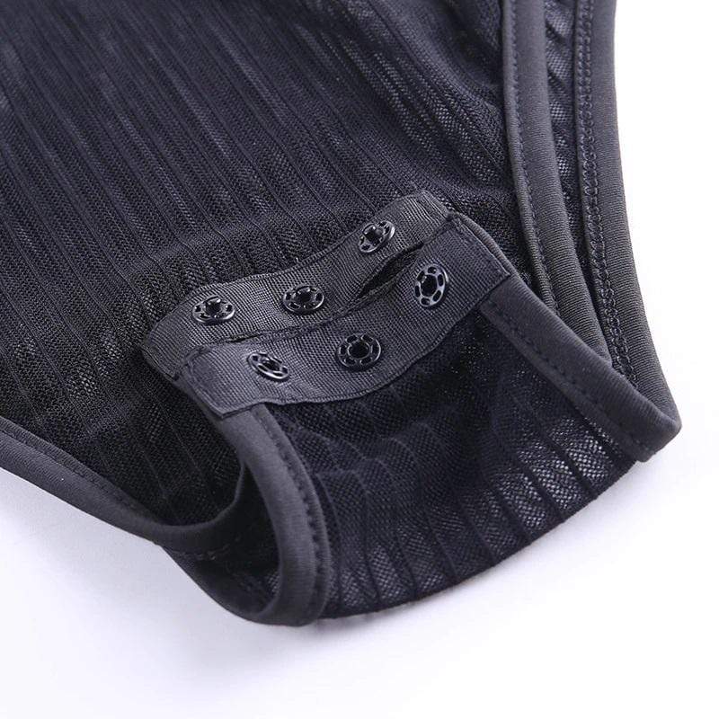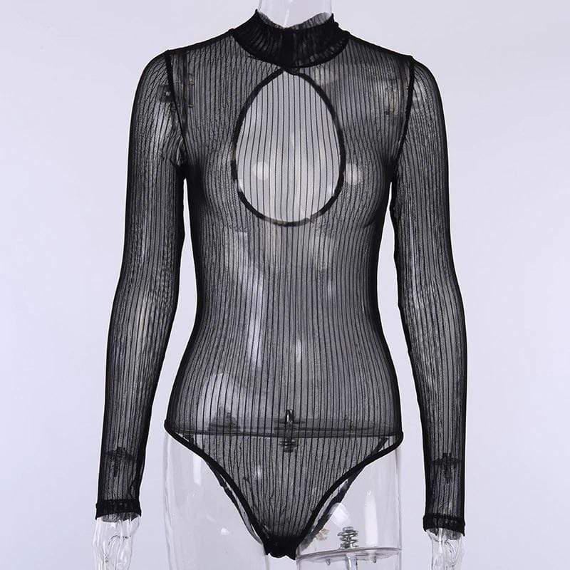 She is fire - watch yourself or you'll get burnt. Our 'Midnight Pleaser' sexy black bodysuit will make hearts skip a beat. This dangerously hot long sleeve sheer bodysuit has a striped mesh construction, fierce mock neckline and bikini snap N’ button closures.