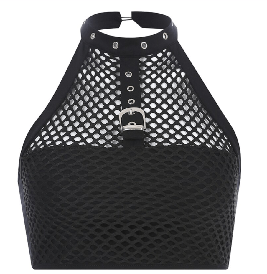 Everyone loves a Lil misery. Disrespect yer surrounding in this rowdy little black lace gothic crop top. This spandex/cotton blend tube top design is combined with a mesh upper area linked to a BDSM choker that would surely get any daddy's attention.