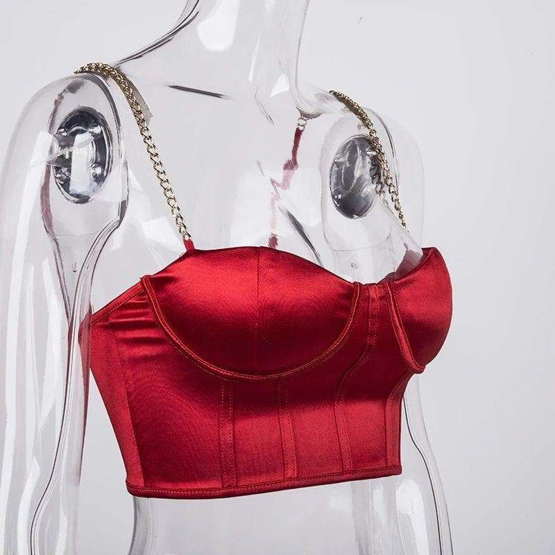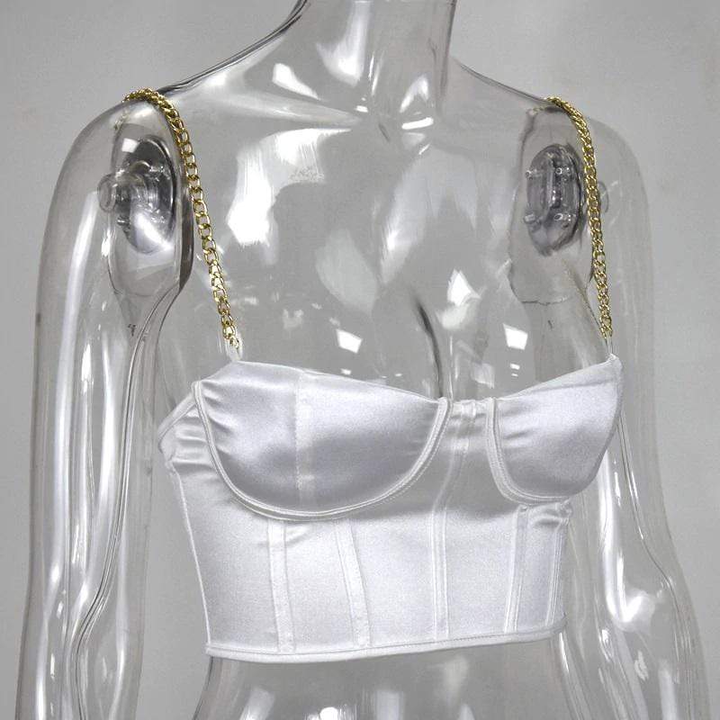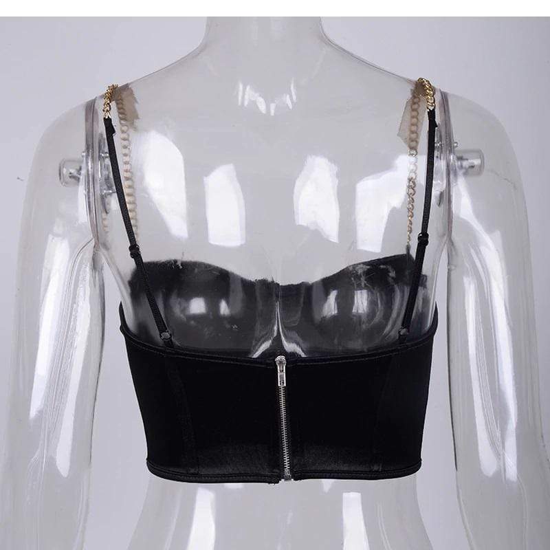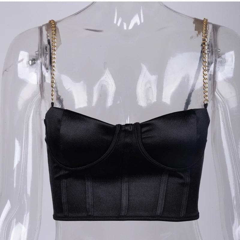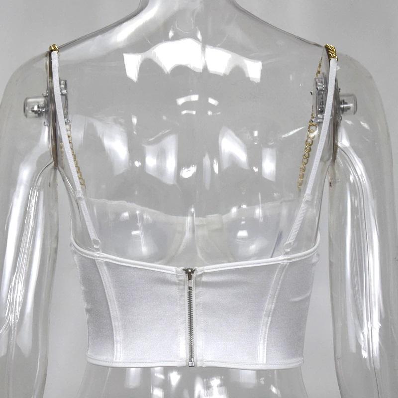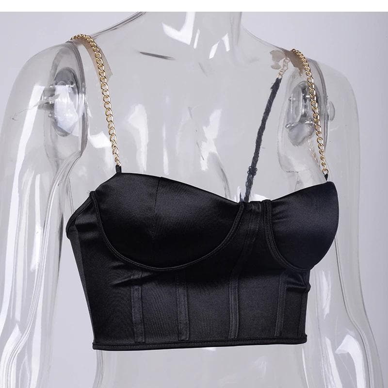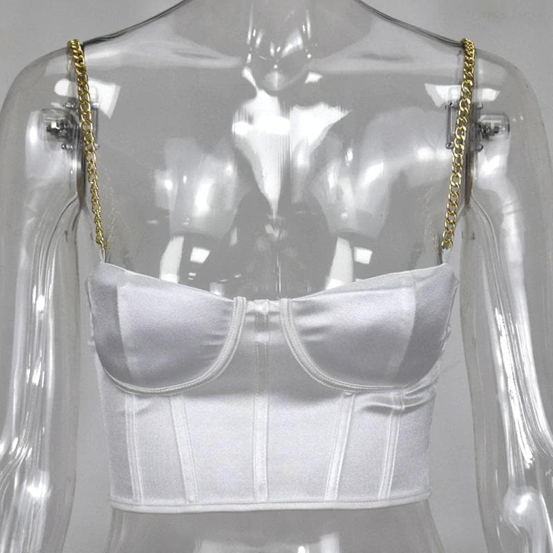 You're the ghost with the most in this cute & sultry bustier crop top! Be the most beautiful babe in the statement satin fabric crop top, complete with chain shoulder strap, zipper closure at the back and cropped body. Imagine a life lived in a fantasy world!