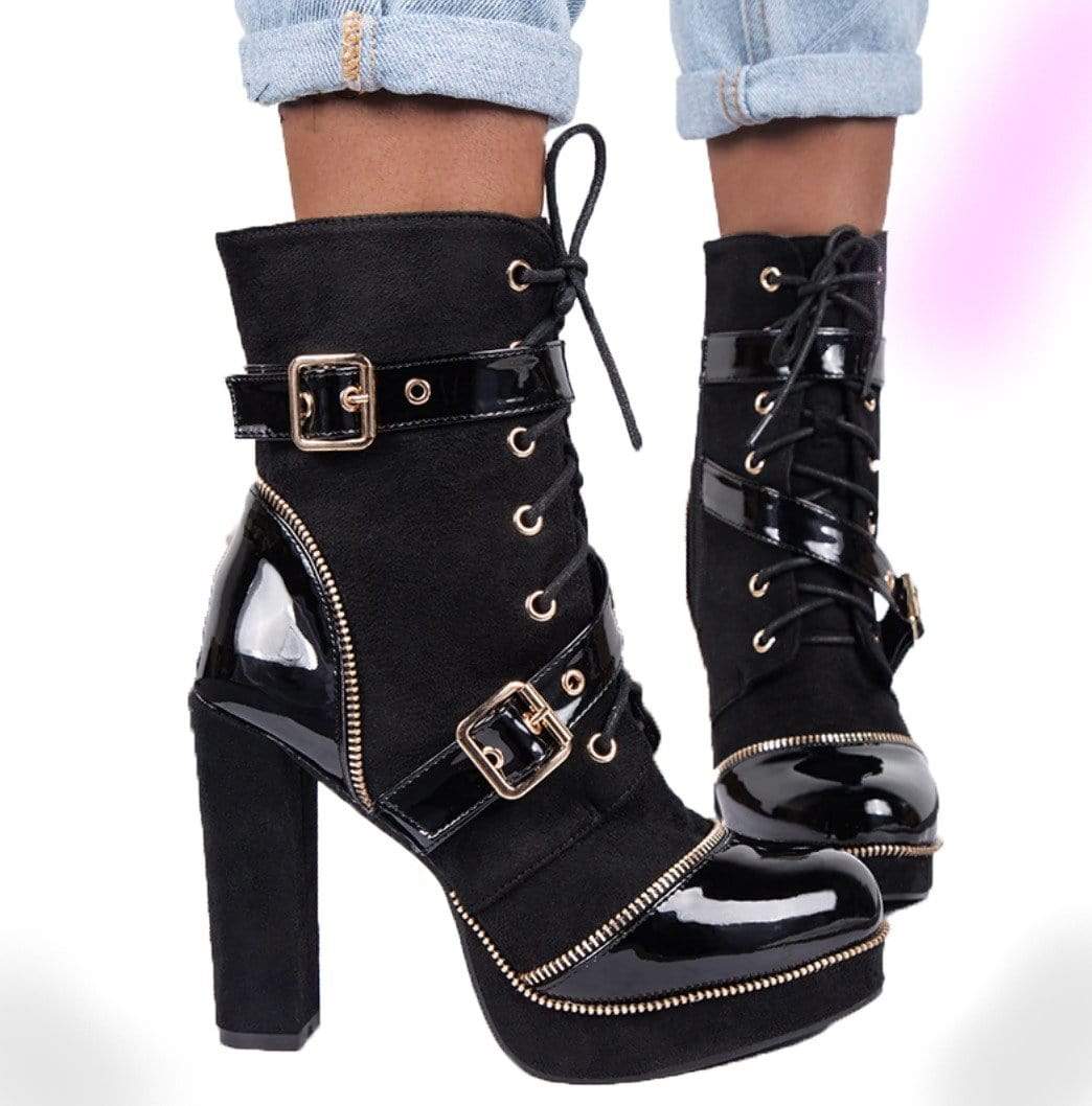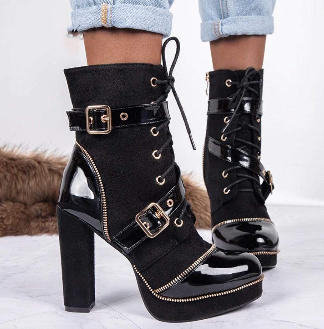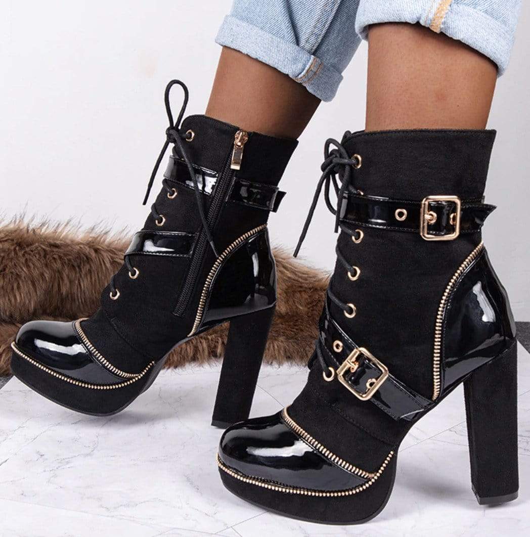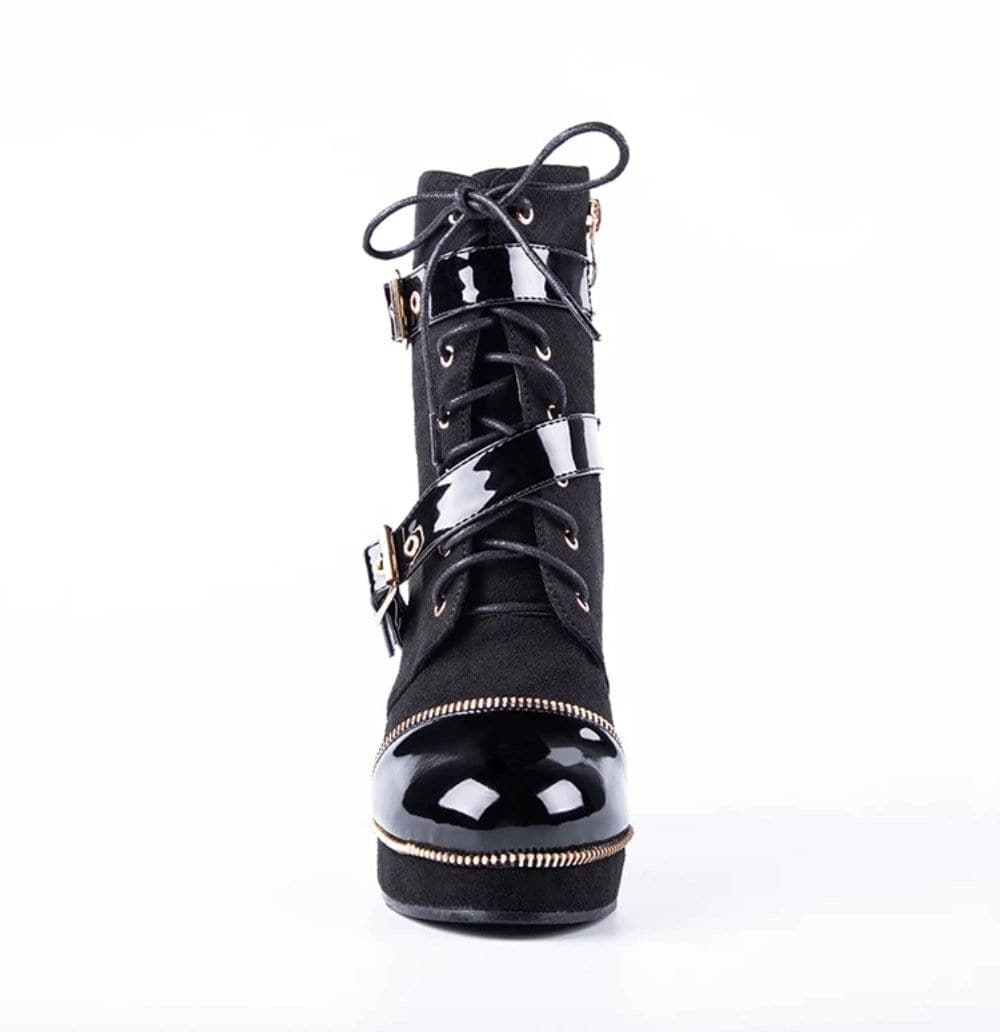 The block/square heel type and mixed material will have walking in them like a pro. The lace closure type, the round toe shape and the flock make these motorcycle boots to crave for.?