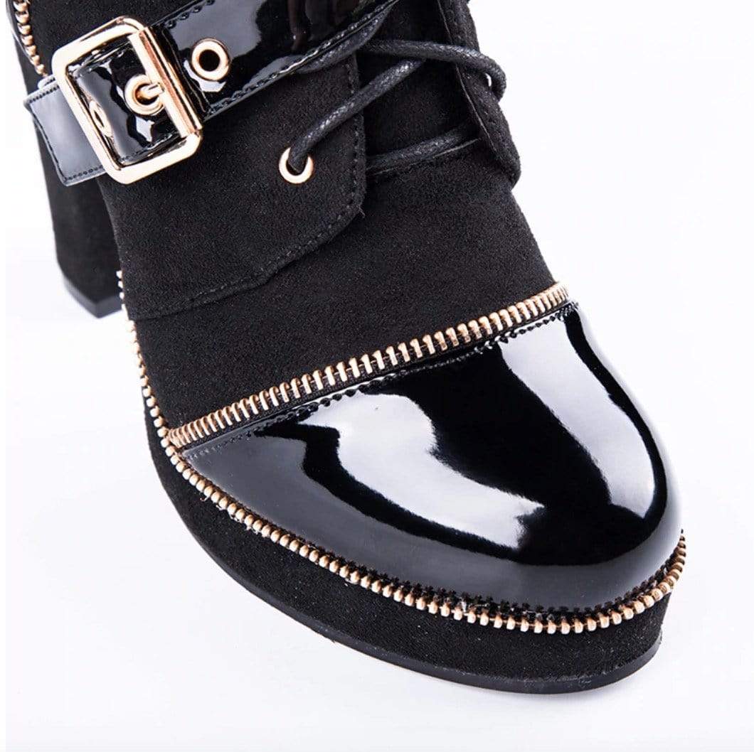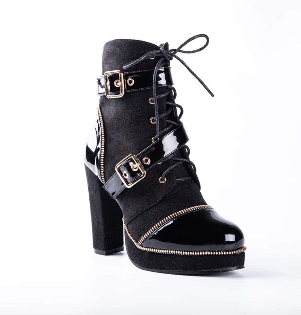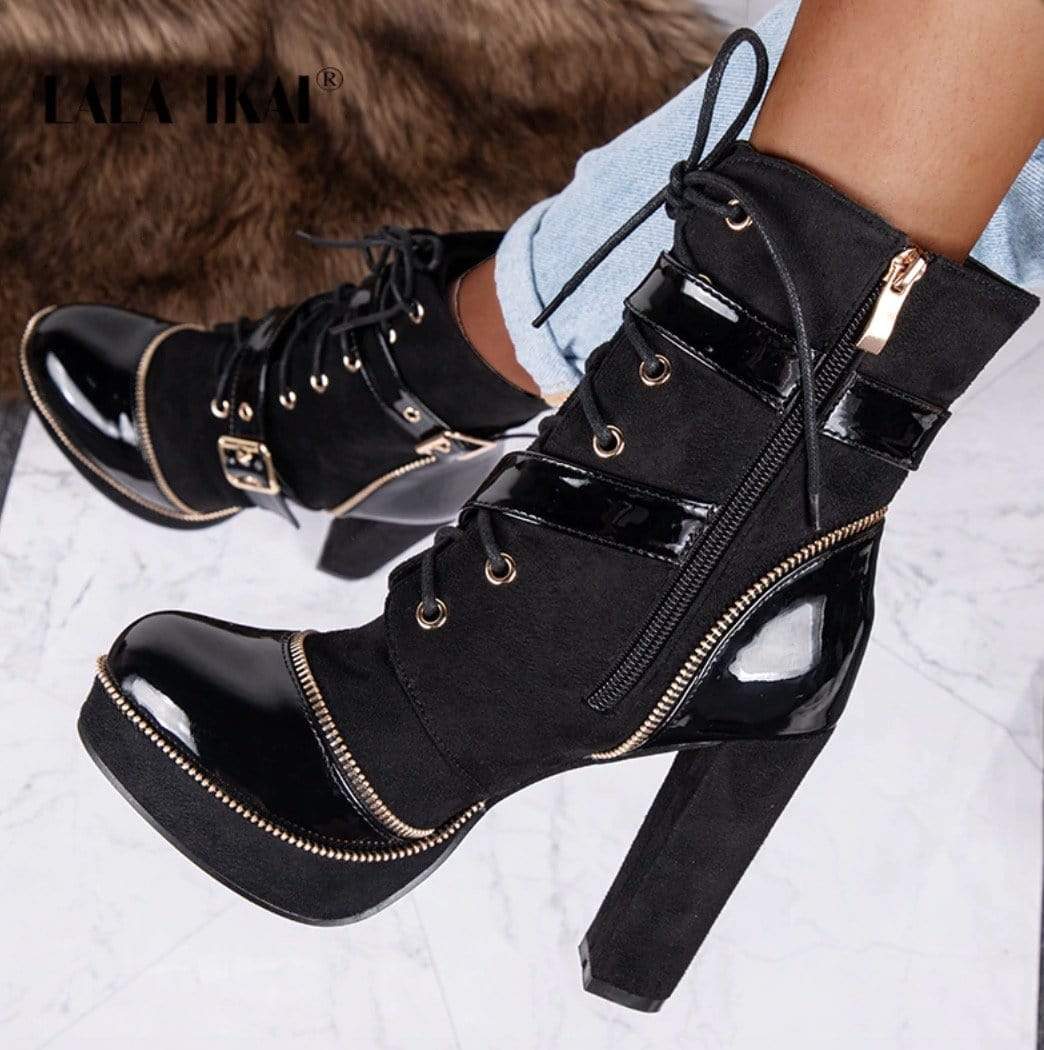 The block/square heel type and mixed material will have walking in them like a pro. The lace closure type, the round toe shape and the flock make these motorcycle boots to crave for.?