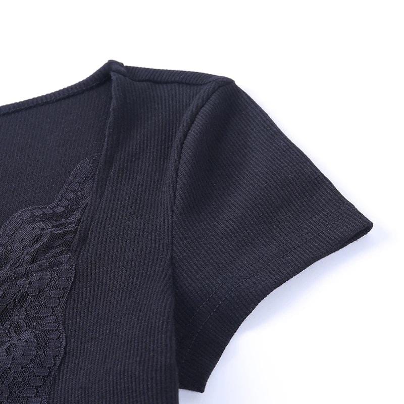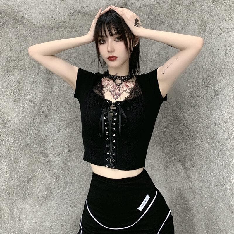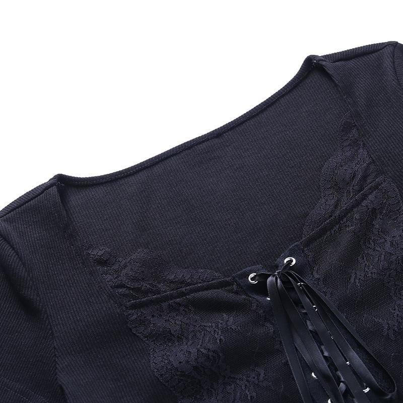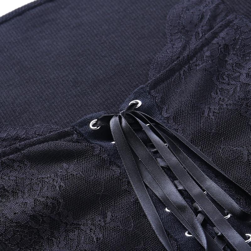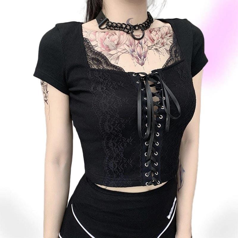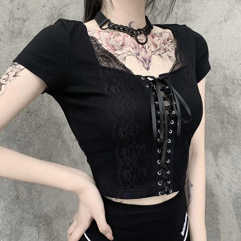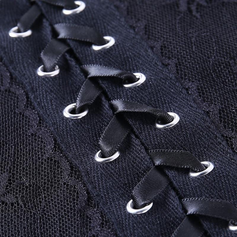 It's a dark paradise! Getting down and spooky with the 'Nova' Lace-up crop top; Composed of soft-touch black poly-cotton fabric for a nostalgic look - with a square lacey neckline, lace-up front, and ribbon tie. An essential piece - easy to wear and goes with anything!