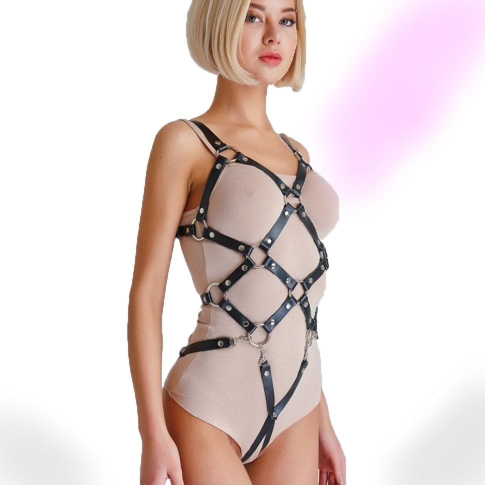 This body harness is made of synthetic black leather straps which crisscross in all the right spots and outline the torso in a most complementary fashion.