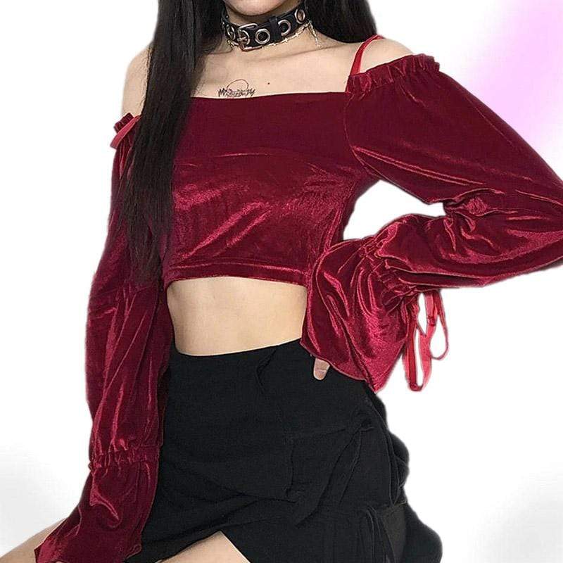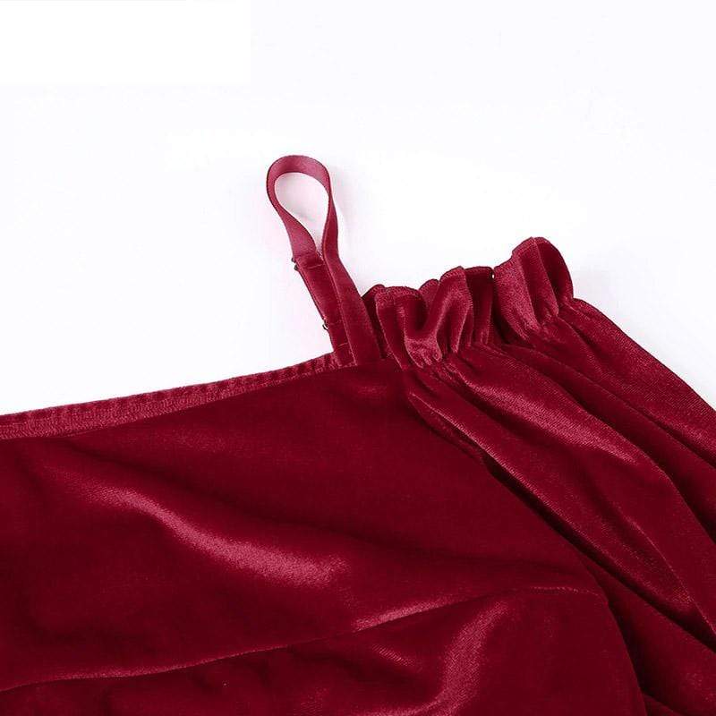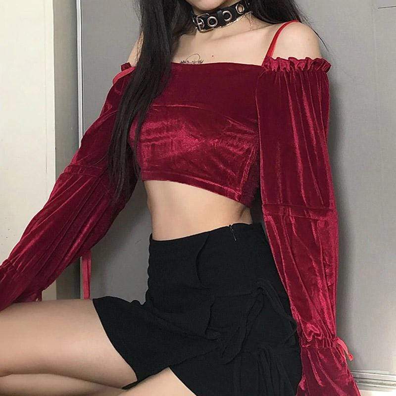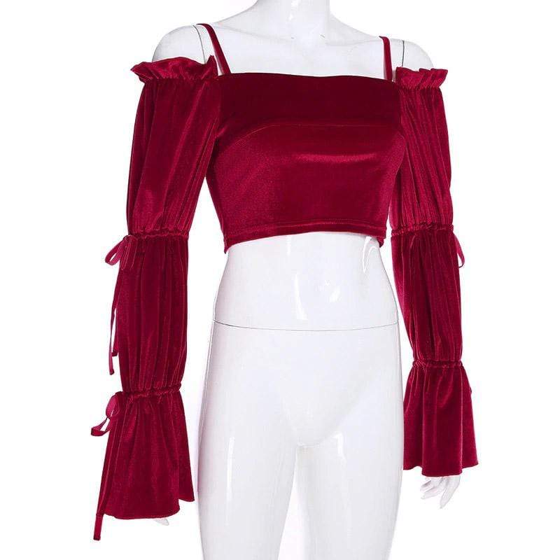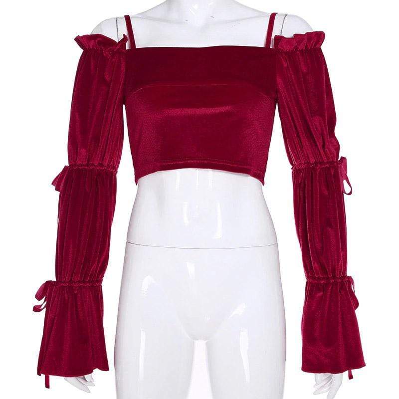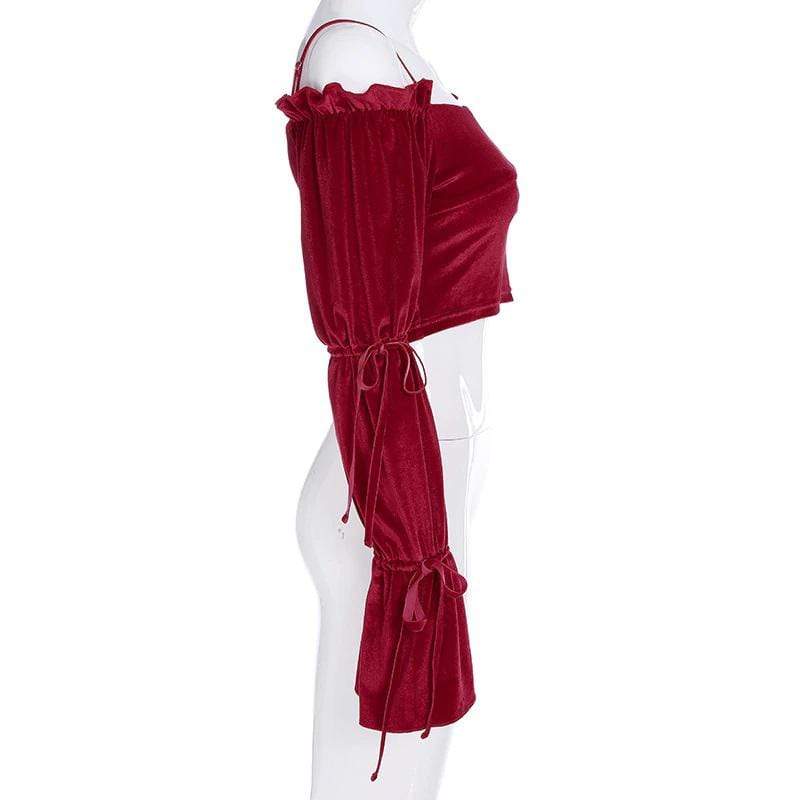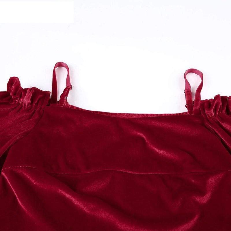 Red Velvet Gothic Crop Top because you’re really just a big softie sweetheart. This sexy vintage crop top has an off-shoulder and backless style with thin spaghetti straps. It Feature its long lantern sleeves with ribbon ties.