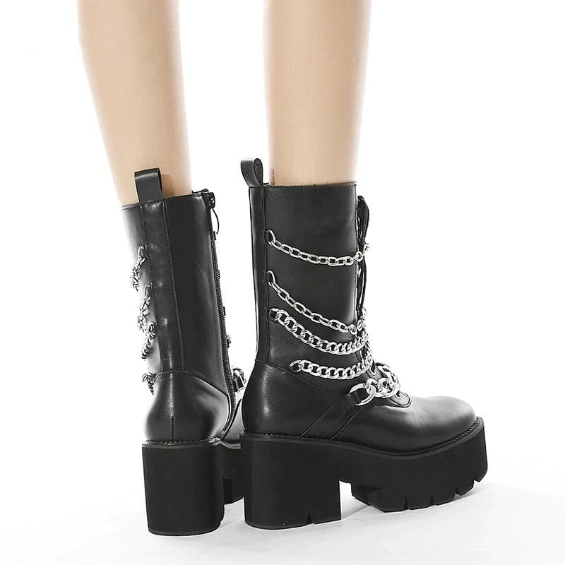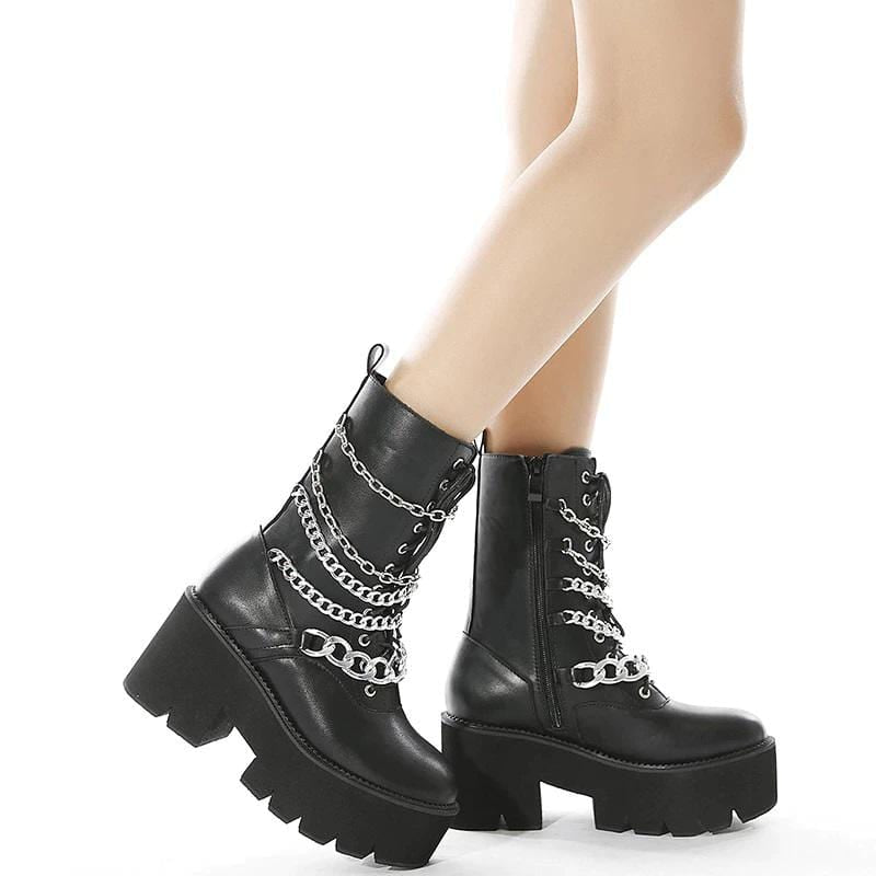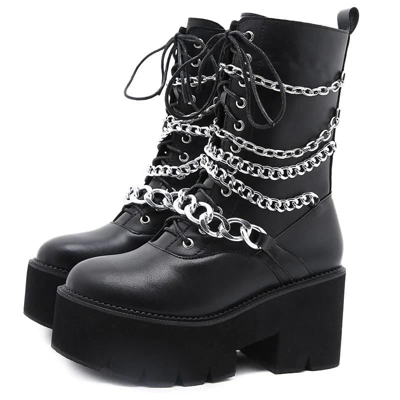 Haunt the shadows in these Riff Chunky Platform Boots! Beautiful silver chain charms haunt the quality vegan leather, possessed a 8 cm chunky heel and 5 cm platform to give your spooky self some hella height!