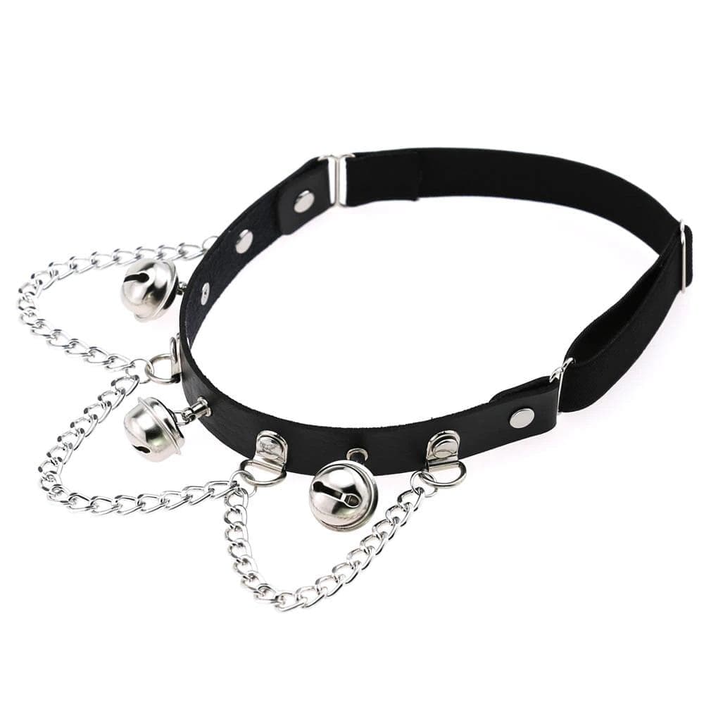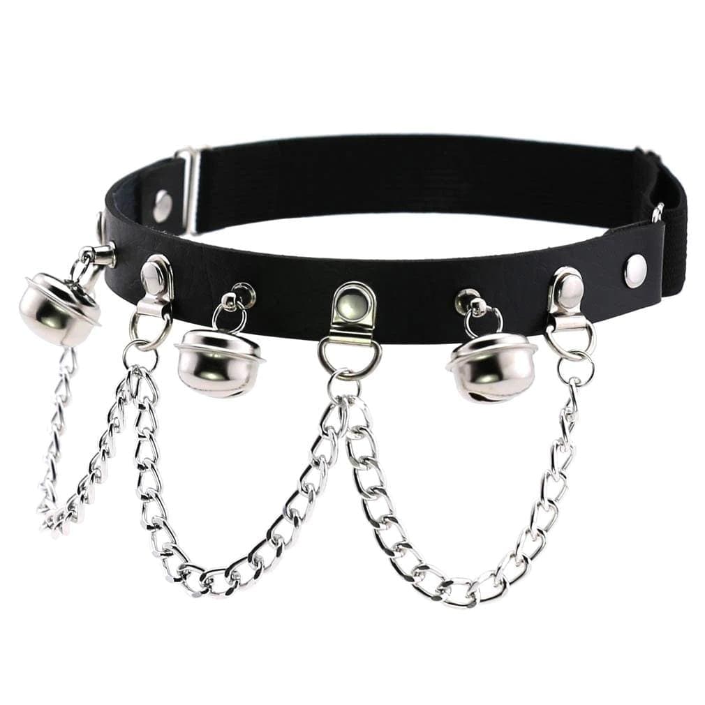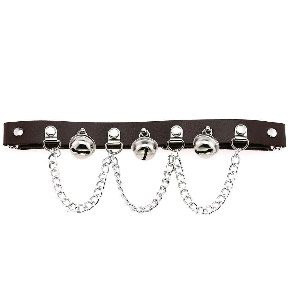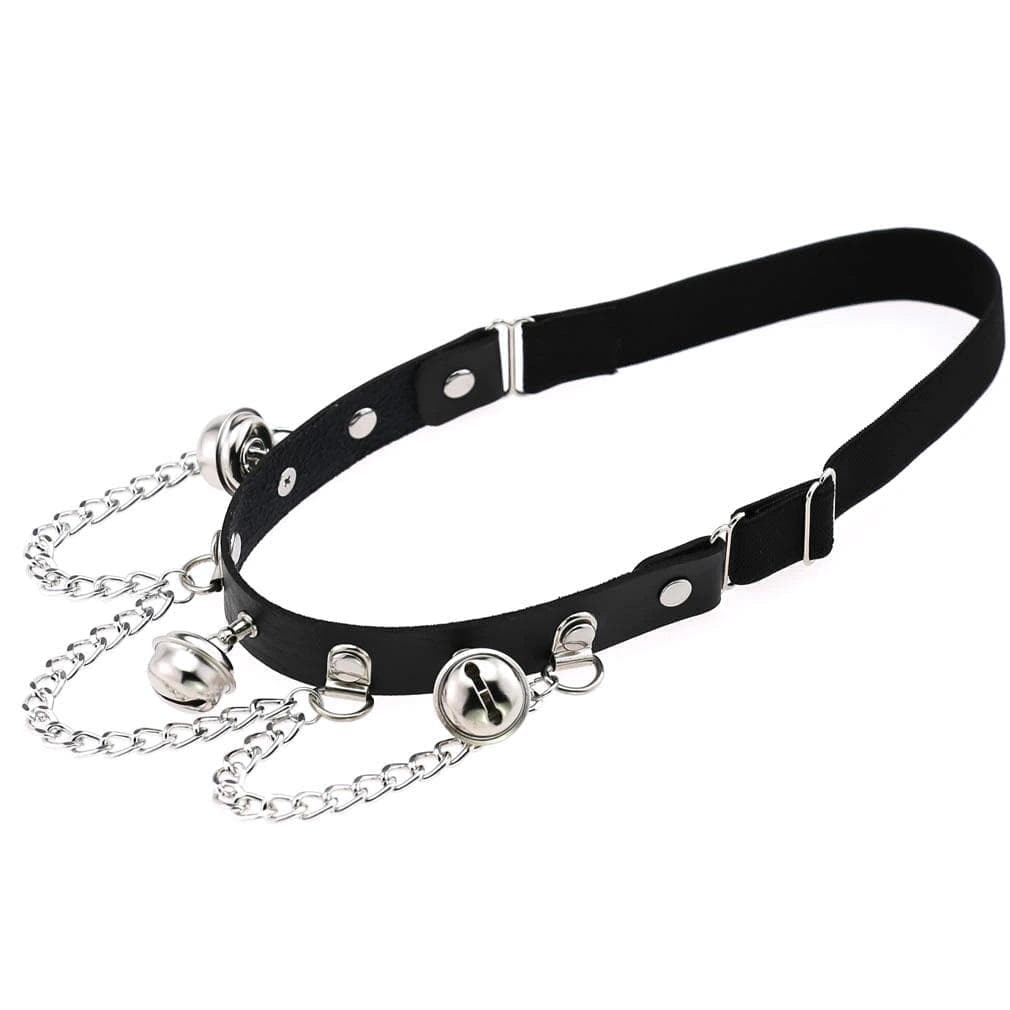 Take charge in this deadly desirable 'Ring My Bell' leg garter. Featuring faux leather with adjustable straps at the back and studded hardware, chains and bells details on the front.
