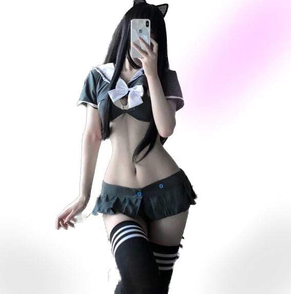 Package includes: Mini top + bra + Miniskirt + Panty (no stockings and can be purchased in the store)