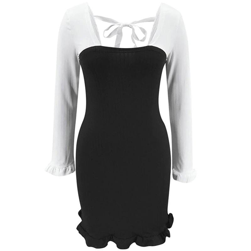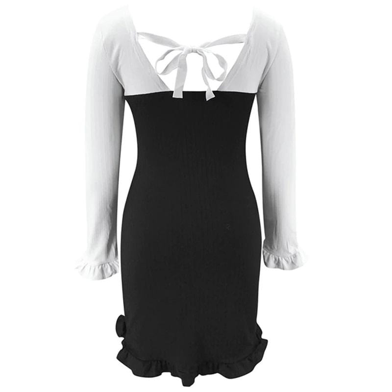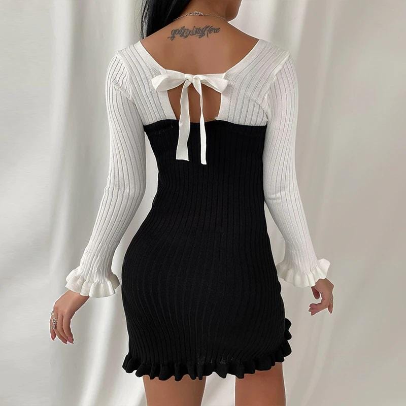 Keep it cozy while looking badass in the Secret Love Ruffle Mini Dress. Featuring a black and white ribbed fabric construct, long sleeves, and stylish lace-up at the back complete with ruffles on hems, you'll be ready for cold days while looking hot.?