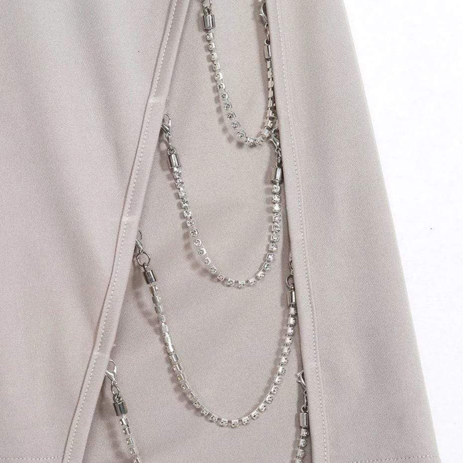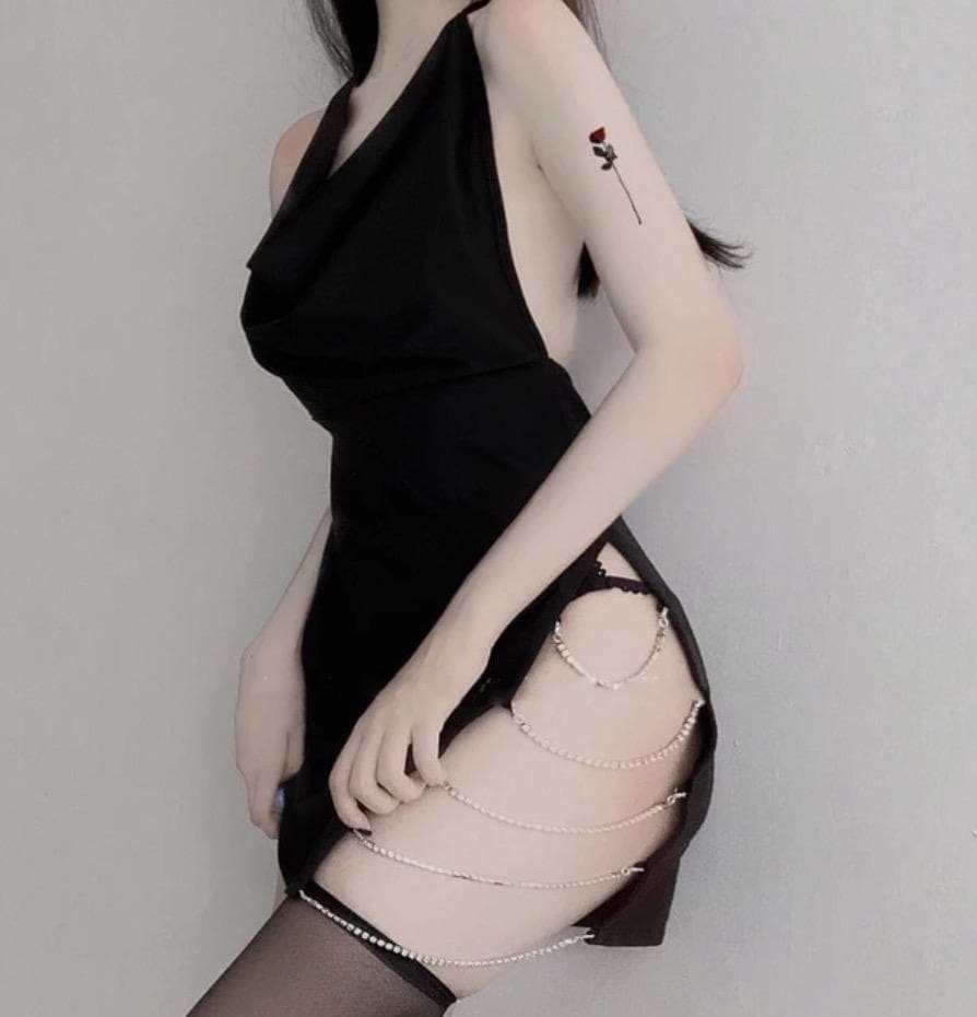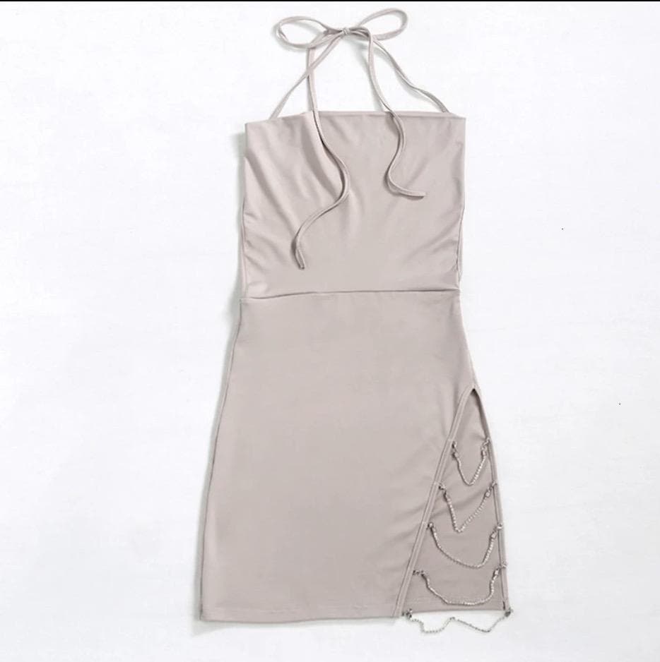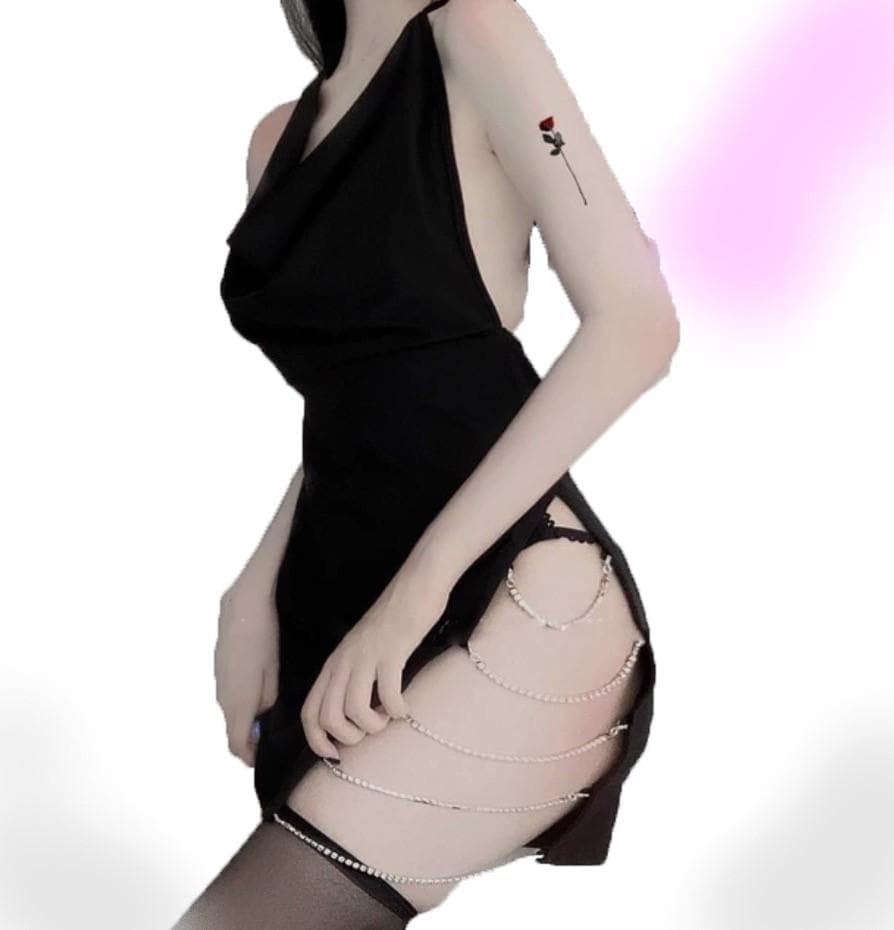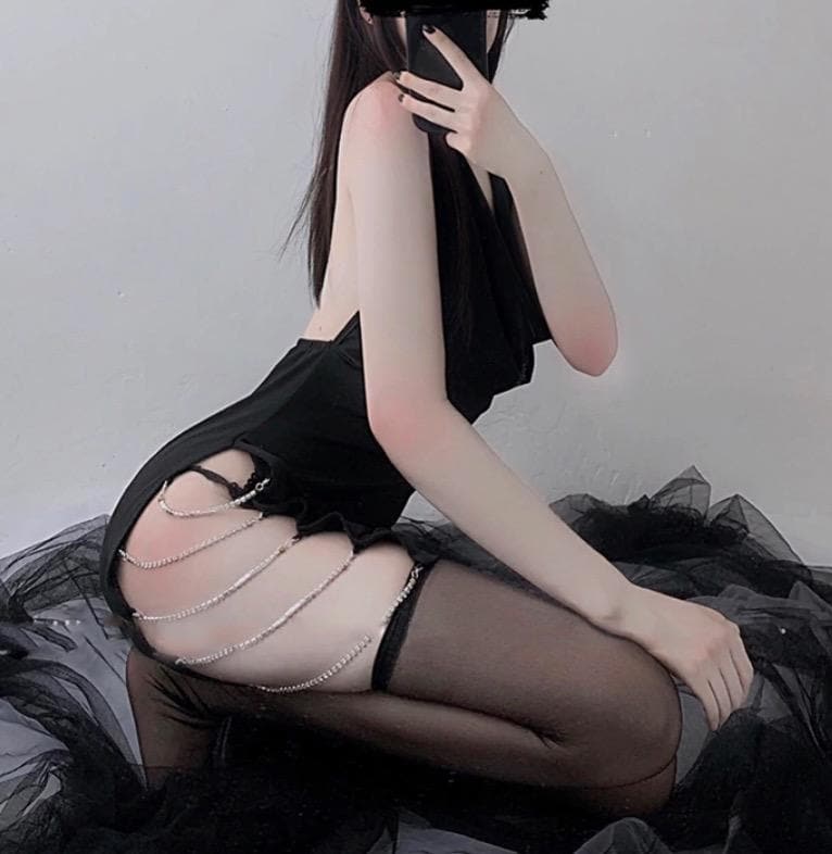 The name alone . . . Sinful Seduction Lingerie . . . just about says it all.? But what it doesn't tell you is this piece is made of a soft and silky polyester that ties around the neck while leaving the back open to the waist.? The plunging neckline is delightfully sinful and the cut out side (which is held together with five silver tone chains) is what makes it so seductive.