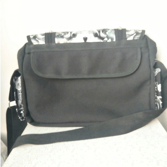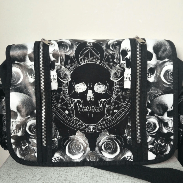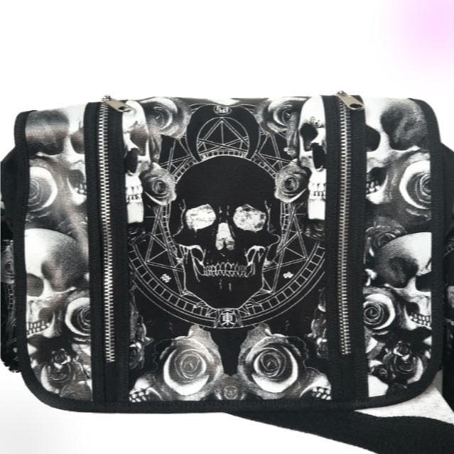 Skull Roses Shoulder Bag have a black and white print of roses and skulls that has a pocket on it's side and a zip closure to make sure your items are safe.