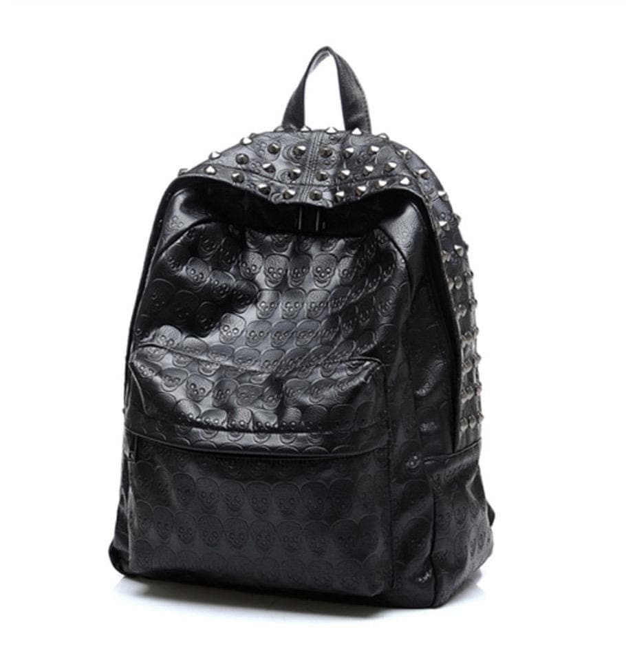 Skull Riveted Backpack. This black backpack has Zipper closure, Polyester material & Riveted decorations.