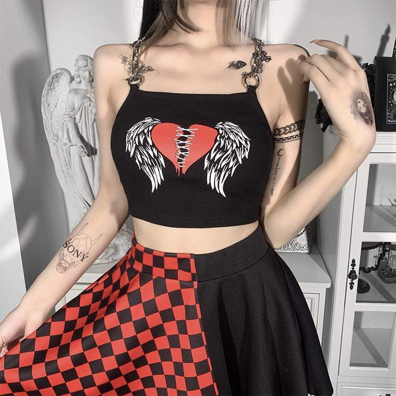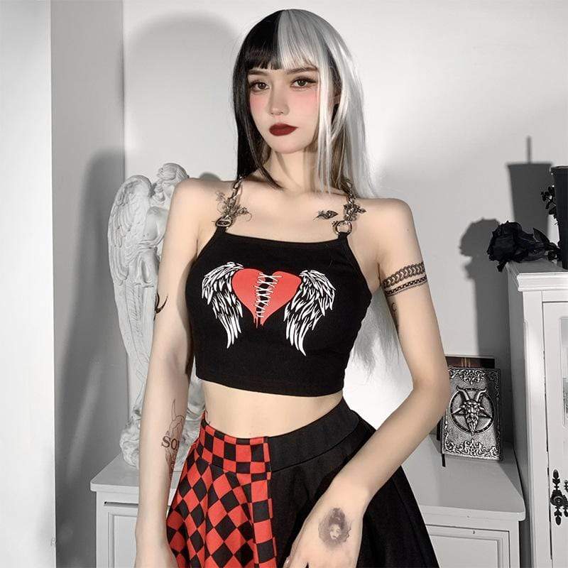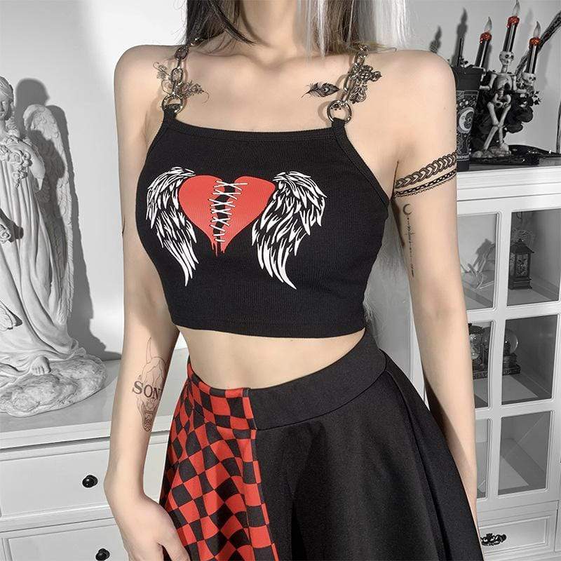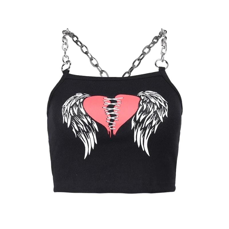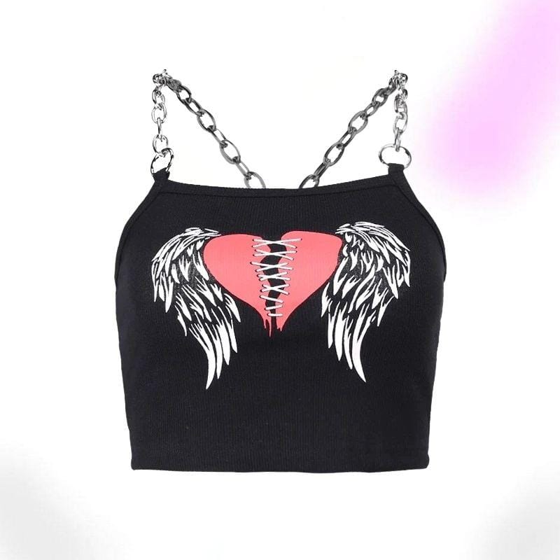 This crop top is made of sexxxy broadcloth and features a printed stitched heart with wings and statement chain shoulder straps.?Put a harness on top, your fave skirt, and some platforms and you're ready to go!