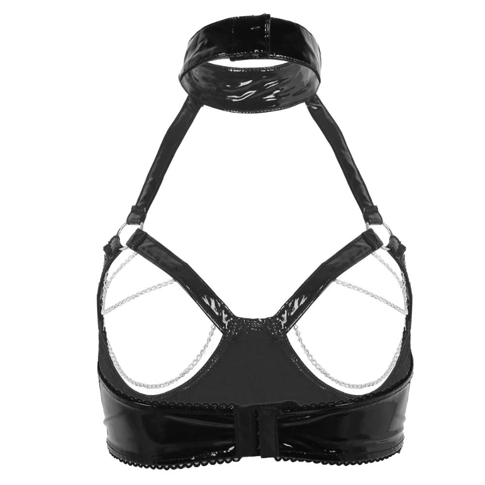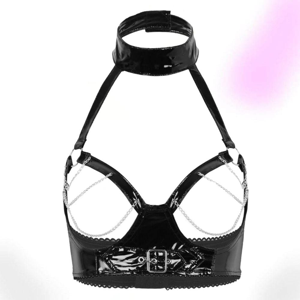 To the moon and never back again. Look otherworldly in the 'Succubus Haven' open cup bra; conjured up using a wet look PU leather and spandex, which stretches to perfection for a seductive and comfortable fit. Features a small buckle at the centre which is adjustable for the desired fit. Finished with metal chains to add more drama. You'll feel like the goddess you are in this erotic sexy bra!