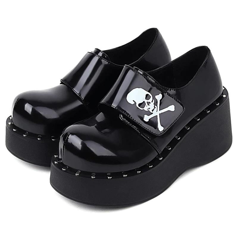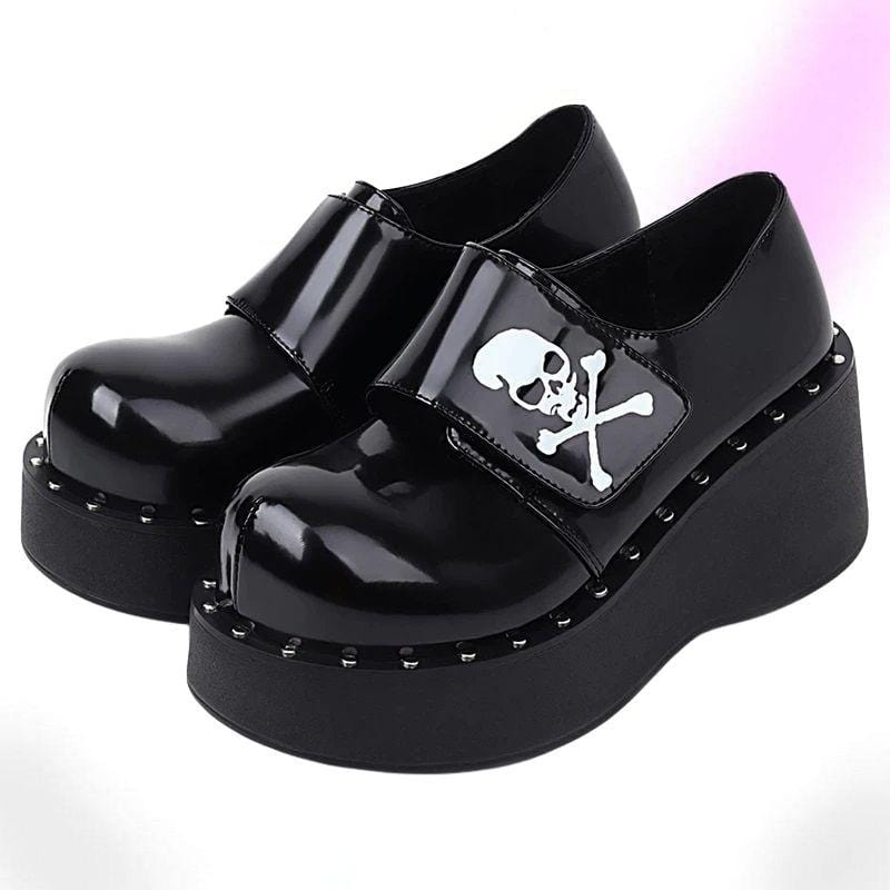 Make a bold statement in our Weak-Kneed Gothic Platform Shoes; with a studded thick sole to give you that extra height. Complete with skull poison decals- ideal for adding some attitude to yer everyday looks.