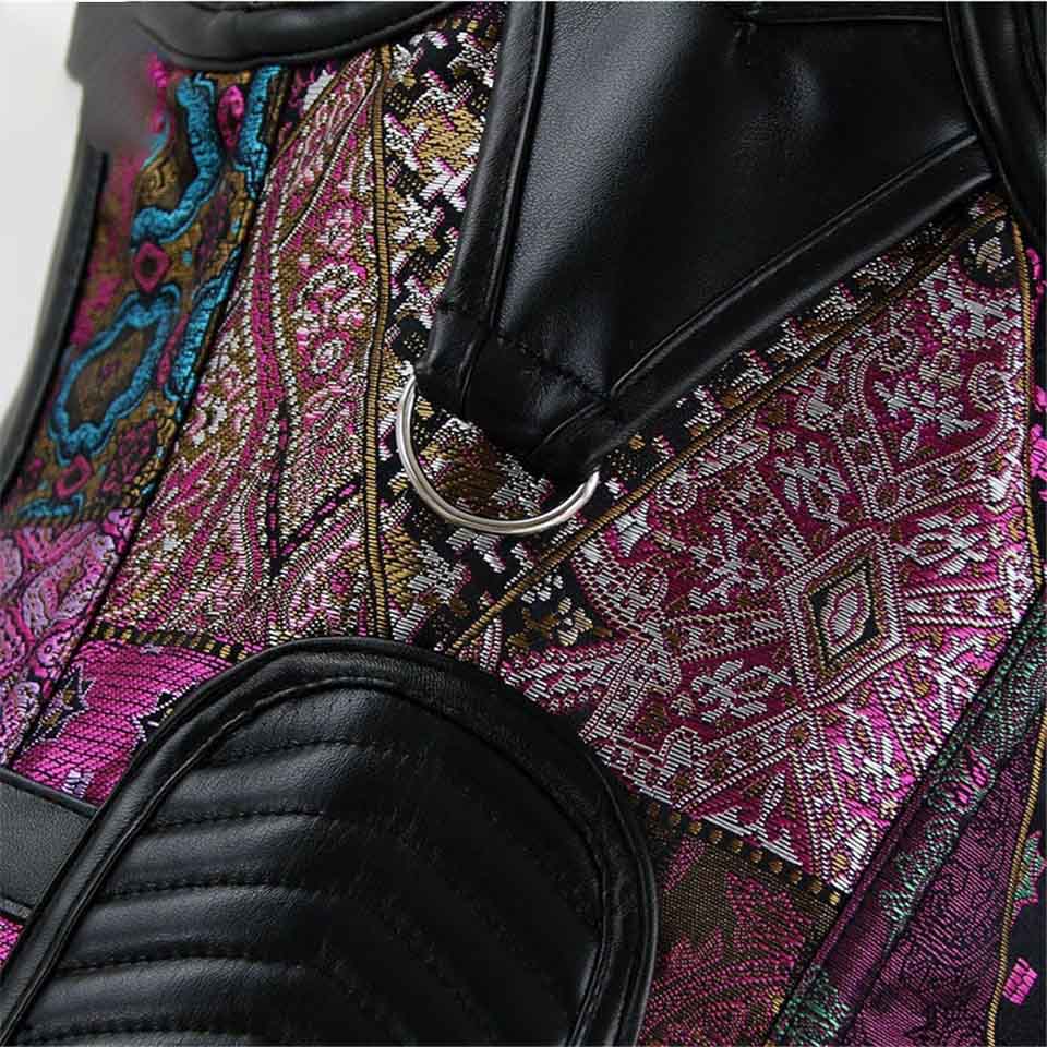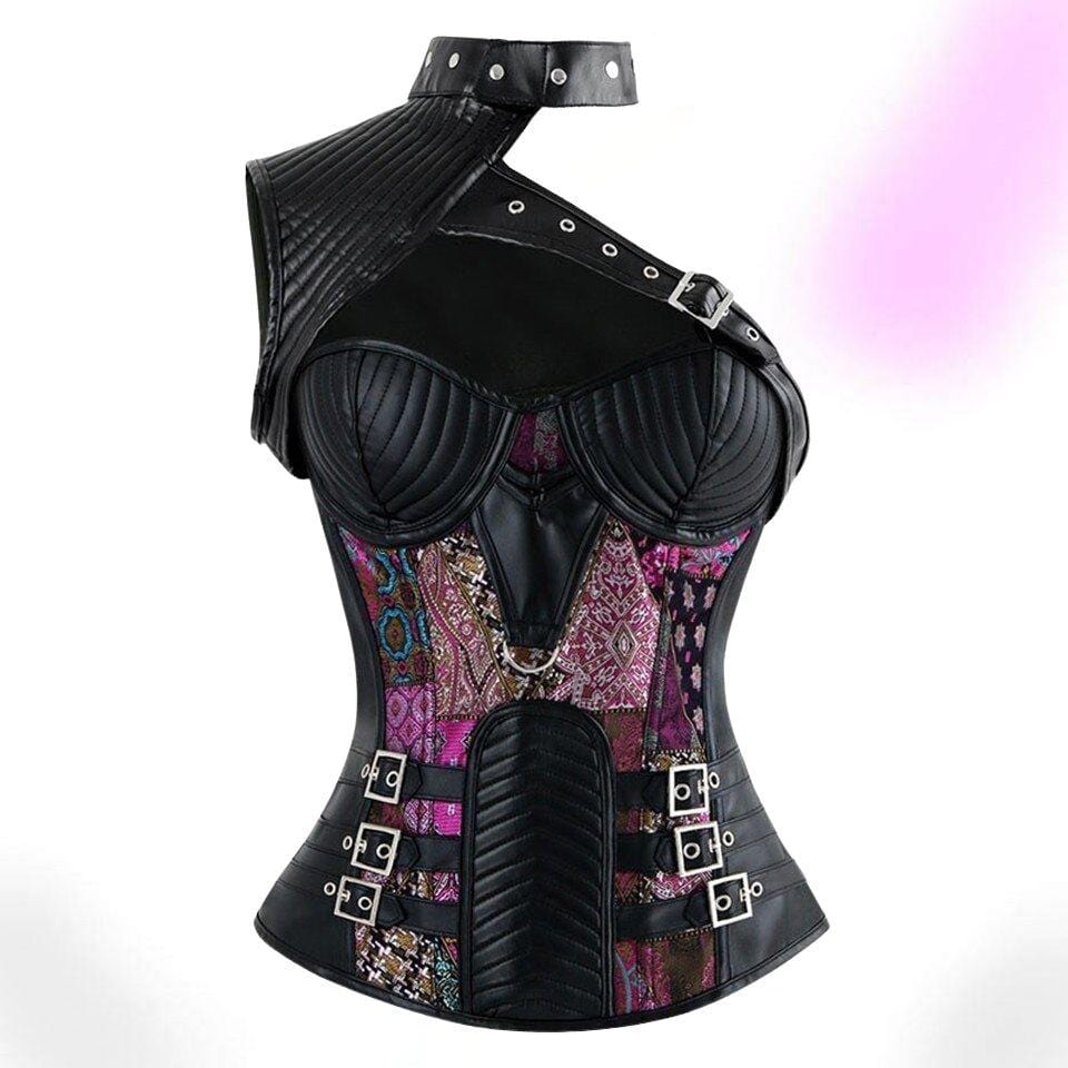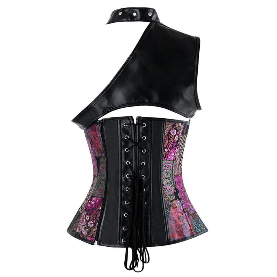 Invite yer demons in and let 'em stay a while. This Wicked Witch Steampunk overbust corset includes a leather shrug with buckles and special totem print steampunk gothic outerwear corset.